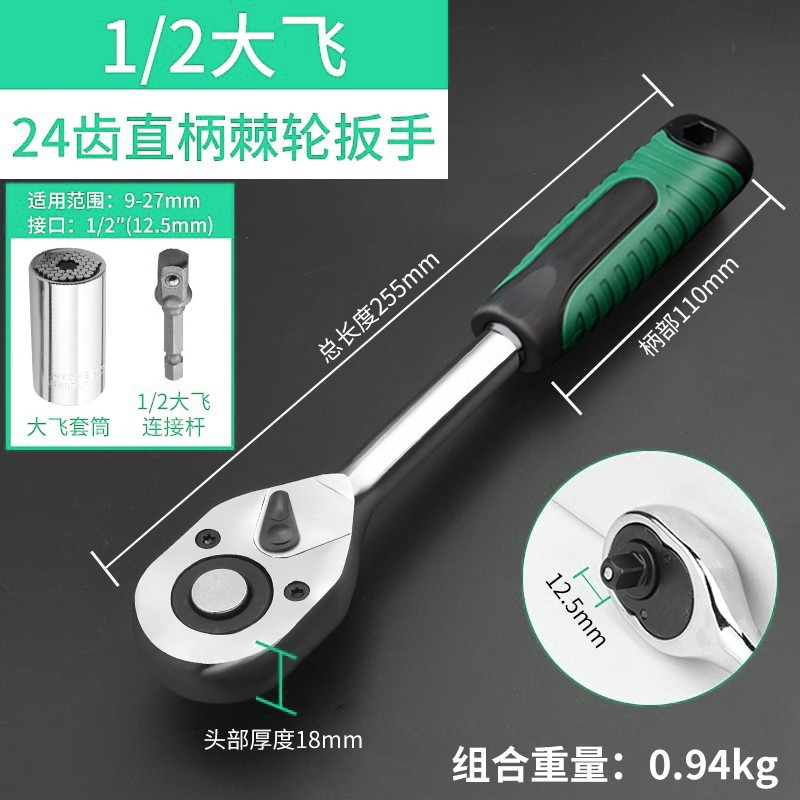 • 1/2 직선 핸들 래칫 렌치 + 범용 소켓 (9-27mm)