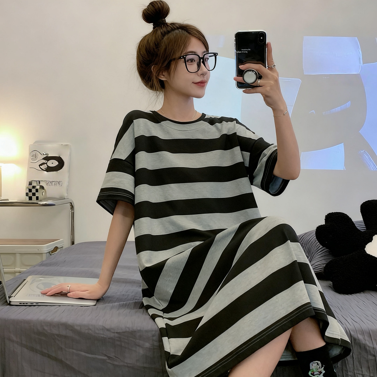 잠옷 여자의 여름 한국식 잠옷 여자의 여름 잠옷 반팔 여자의 여름 가정 옷 세트 학생 귀여운 플러스 사이즈스토어 가기