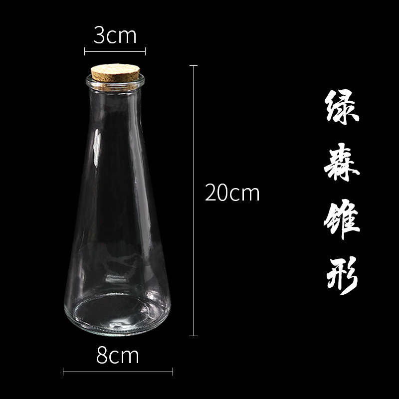 绿森锥形生态瓶尺寸:瓶口径3厘米 底径8厘米 高20厘米
