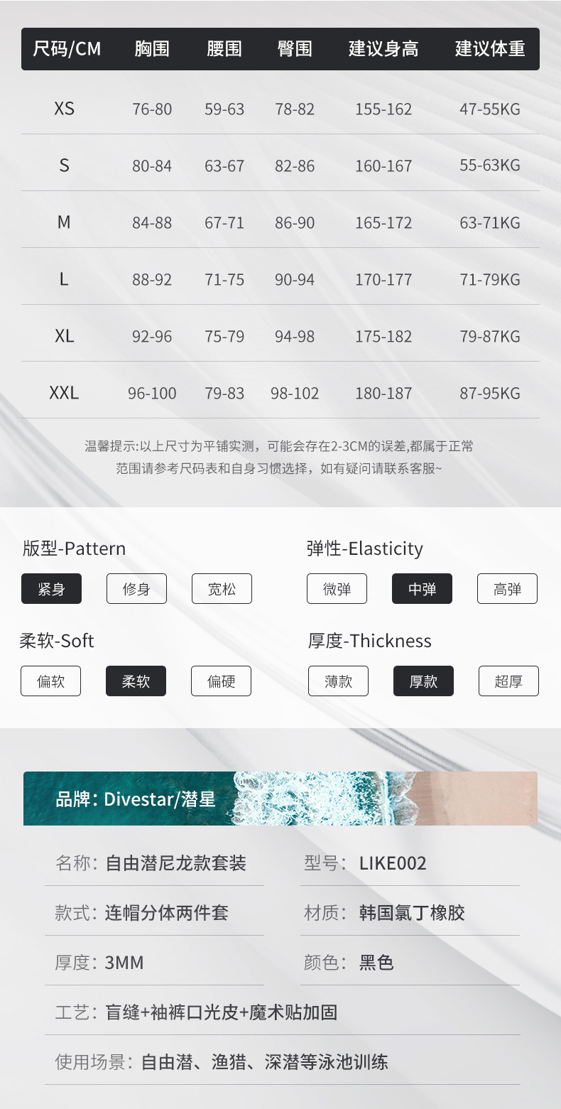 此款产品有CE认证,采用韩国材料,产品内里橡胶opencell材质 ,需要打沐浴露或泡泡水穿穿着时一定要注意方法,没使用过这种材质的请慎拍,请于收货时检查产品,有任何问题及时与我们客服联系,下水后不做任何退换。