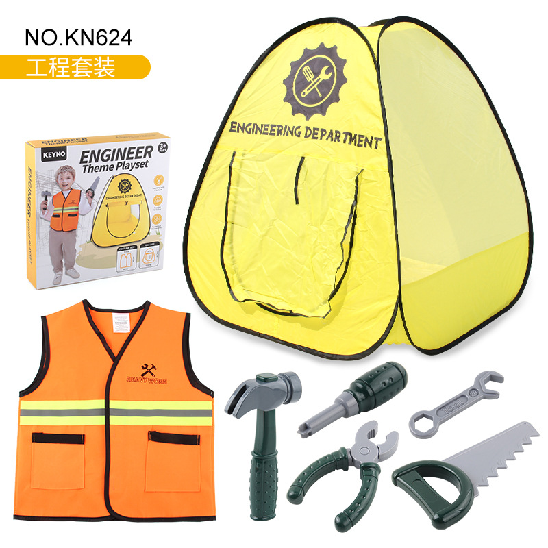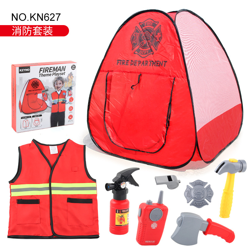 外箱毛净重:21/19 彩盒配置:消防局帐篷搭配消防服和消防工具