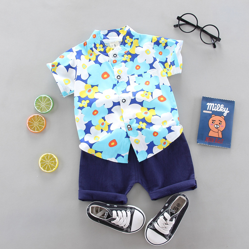 어린이 의류 2023 여름 새로운 어린이 소년 크로스 국경 새로운 만화 공룡 셔츠 면 바지 세트 조수스토어 가기