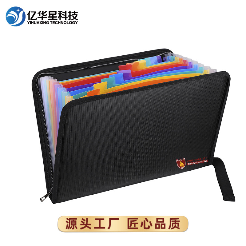 产品功能这款文件袋拥有13层收纳,容量大,可容纳A4纸约40每一个隔层上方都单独设计了索引标签,方便精 内页材质采用700D聚酯,不易断裂或者变形,可随意翻折、 并且这款文件袋可防水防火,外层采用防火硅胶布,绝火耐高温1000摄氏度