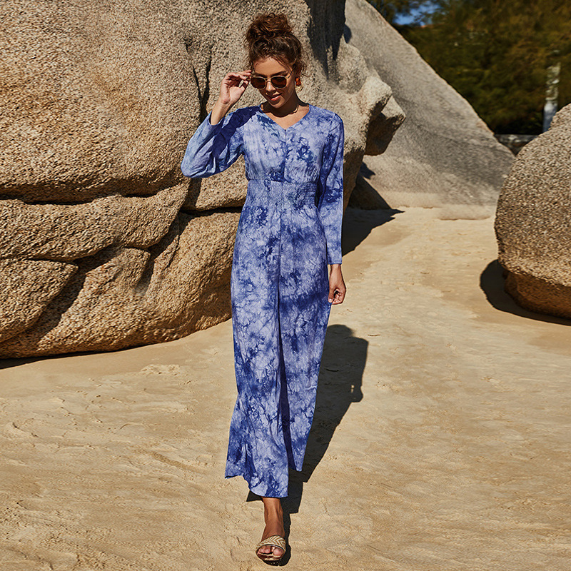 대외 무역 플리츠 하이 웨이스트 느슨한 여성용 스트레이트 발목 길이 바지 크로스 보더 패션 V-넥 슬림핏 긴팔 타이 염색 점프 수트스토어 가기