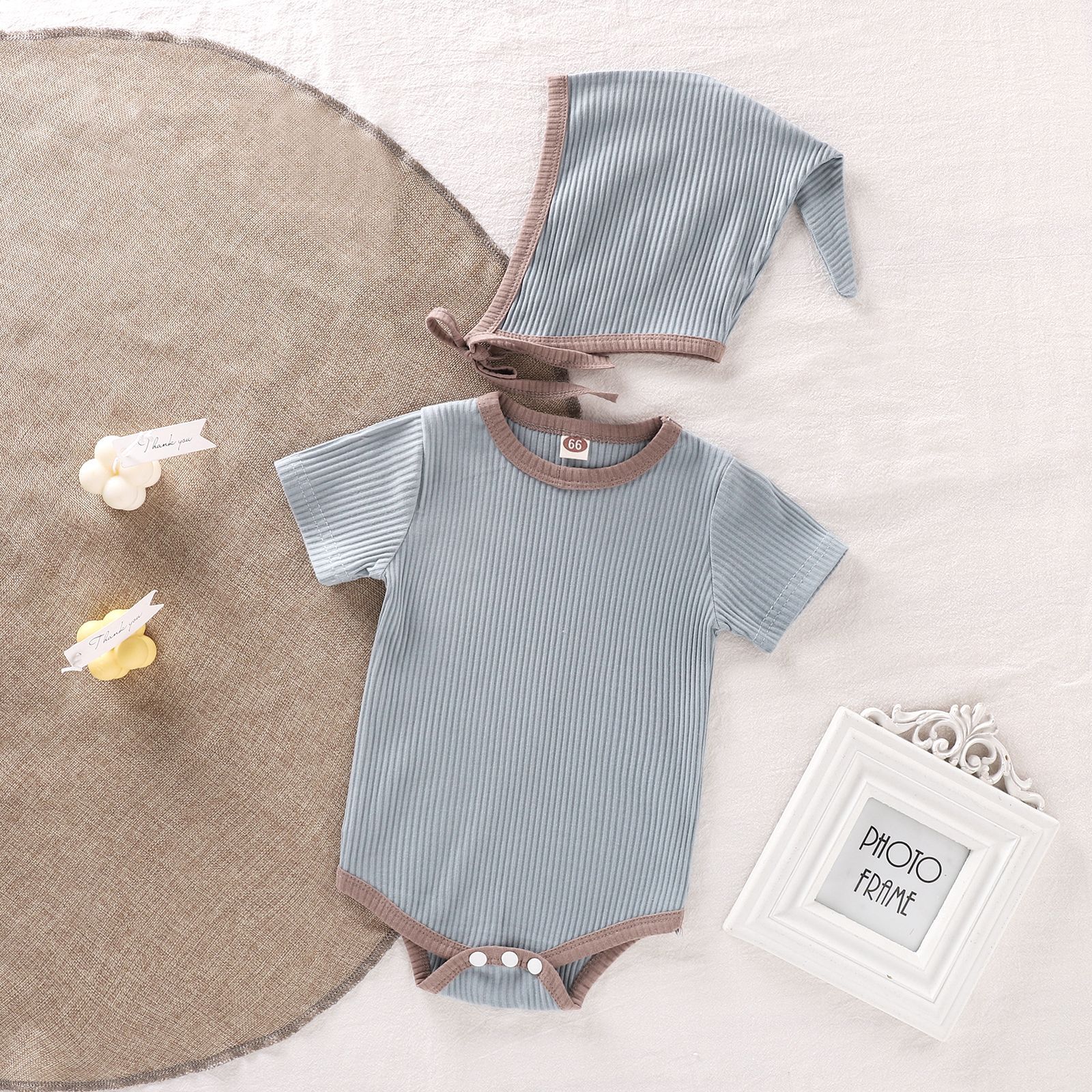 Ins 베이비 베이비 여름 반팔 남성과 여성 베이비 라운드 넥 크롤링 슈트 코튼 핏 스트립 삼각형 크롤링 스트랩 모자스토어 가기
