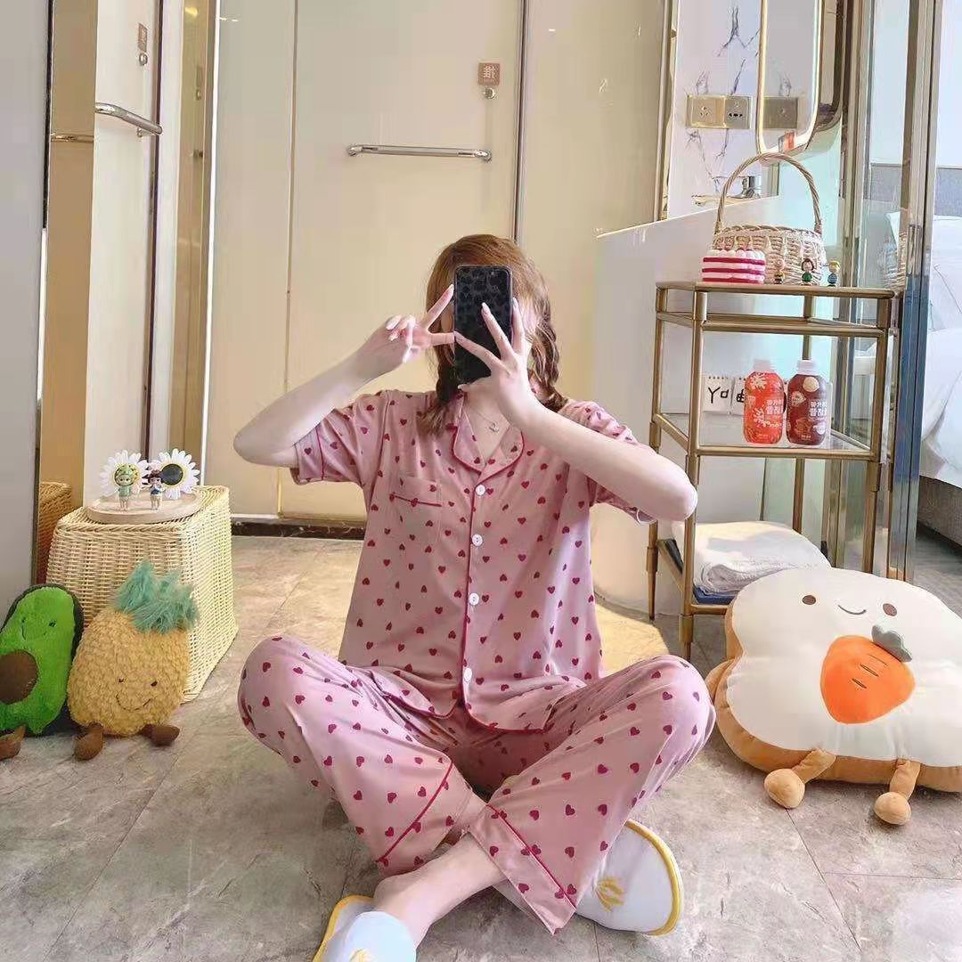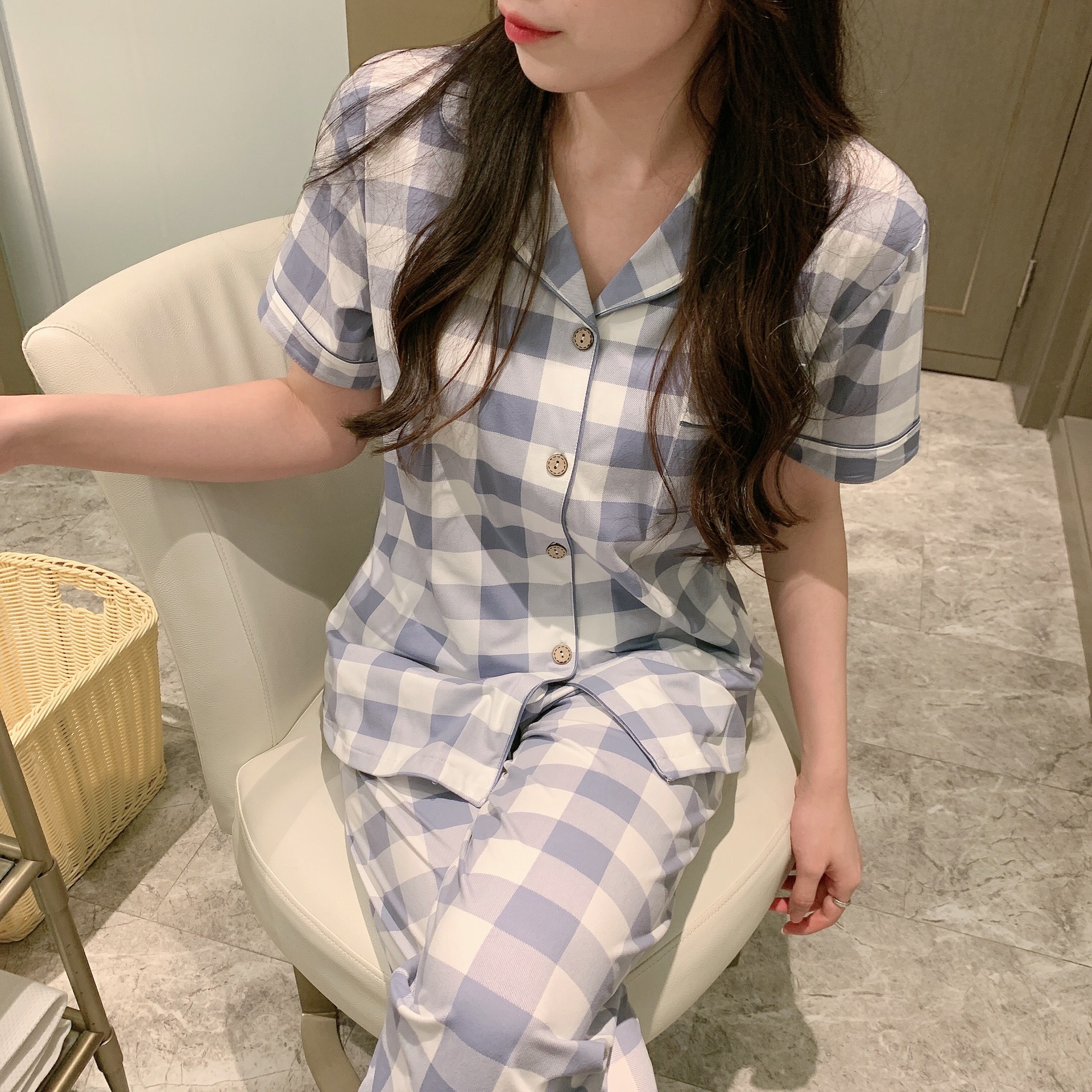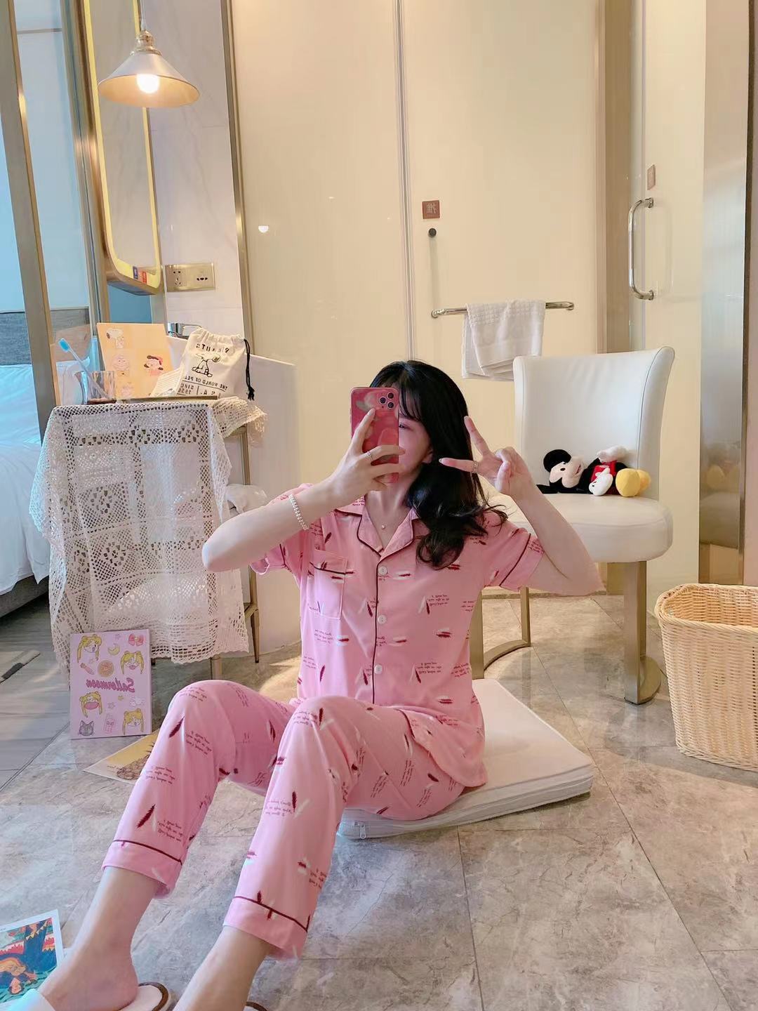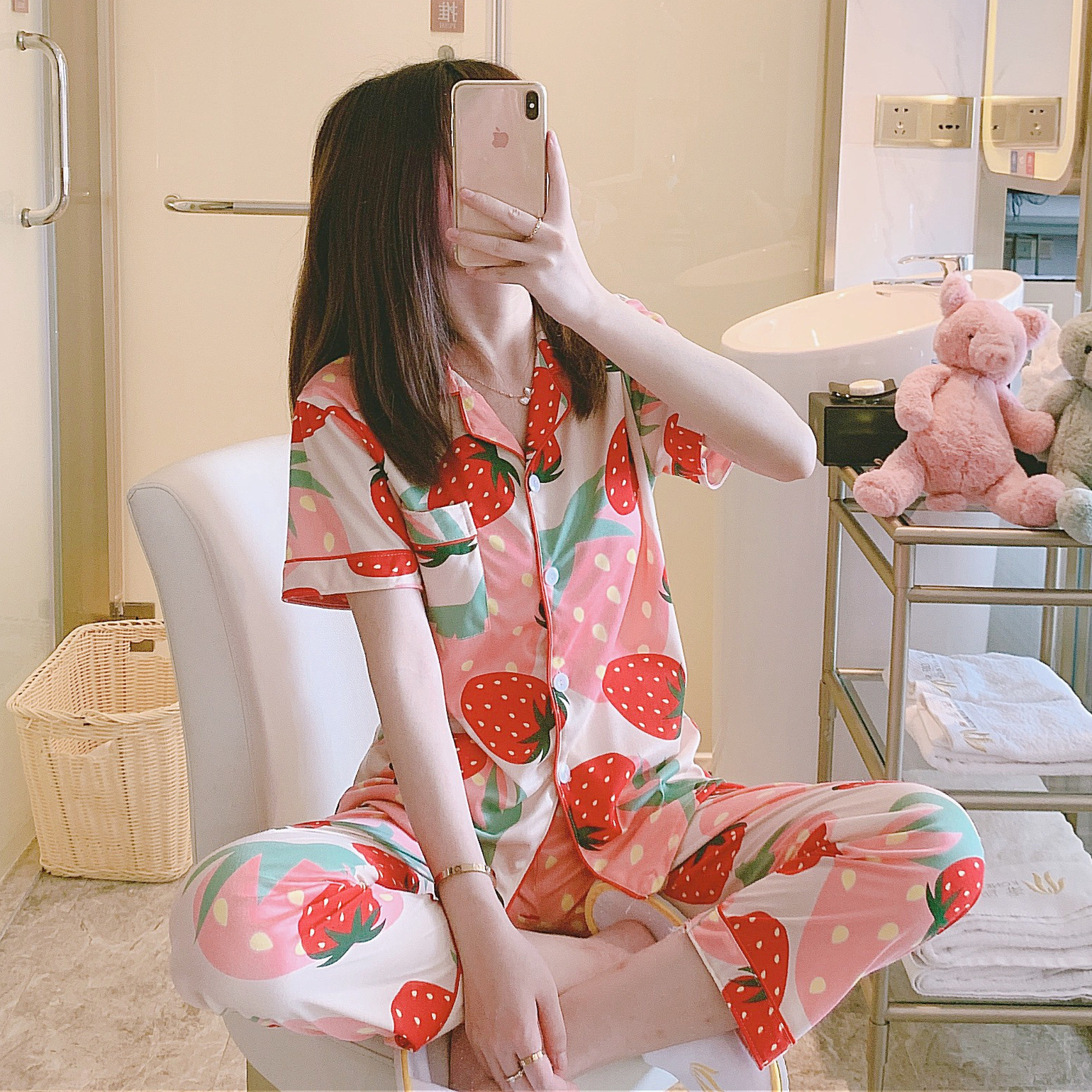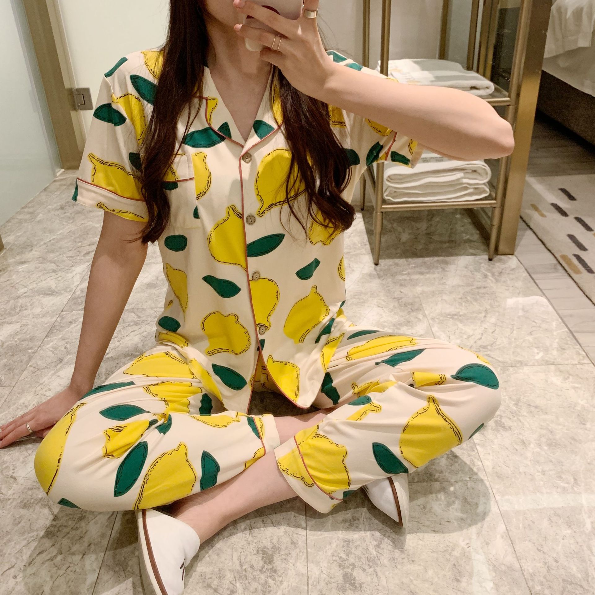 싱글 여름 잠옷 여성용 반팔 바지 카디건 외 발 용품 달콤한 Xueqing 신입생 가정 옷 짧고 긴 세트 한국어 버전스토어 가기