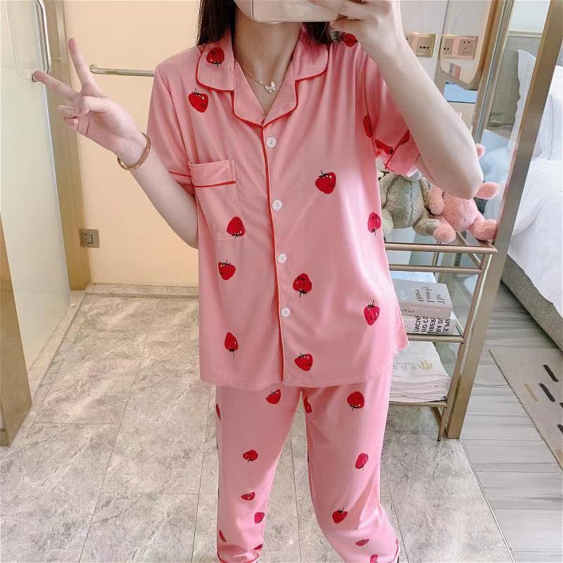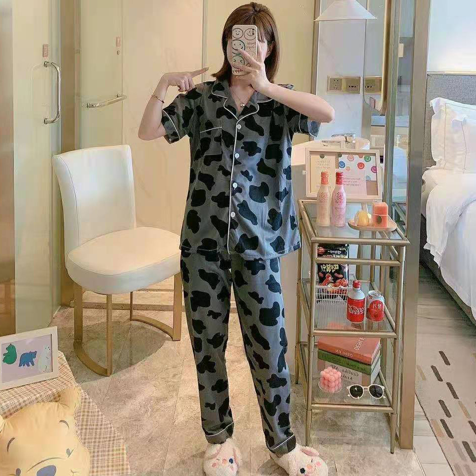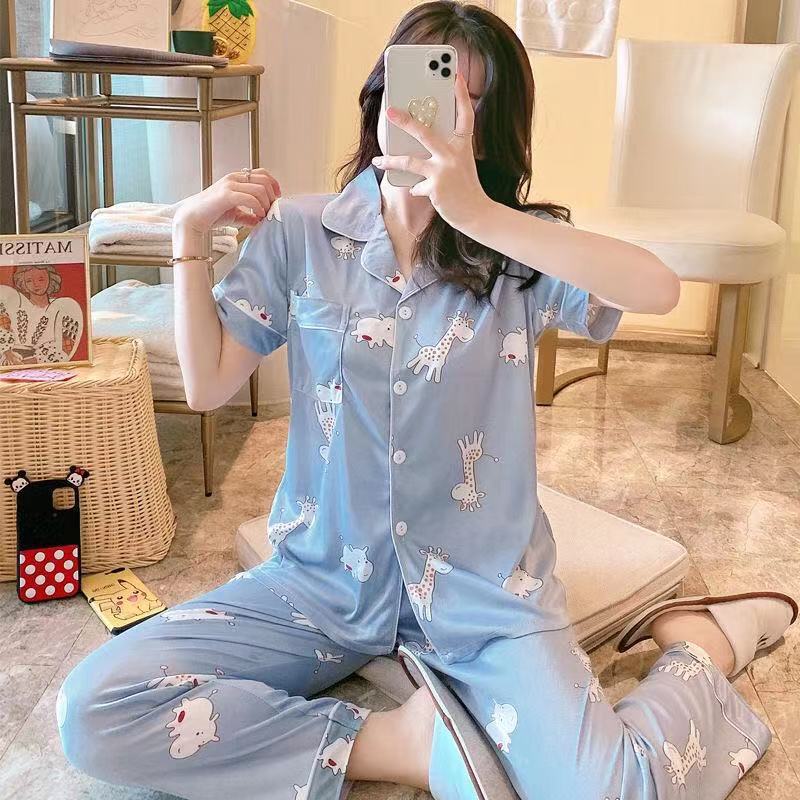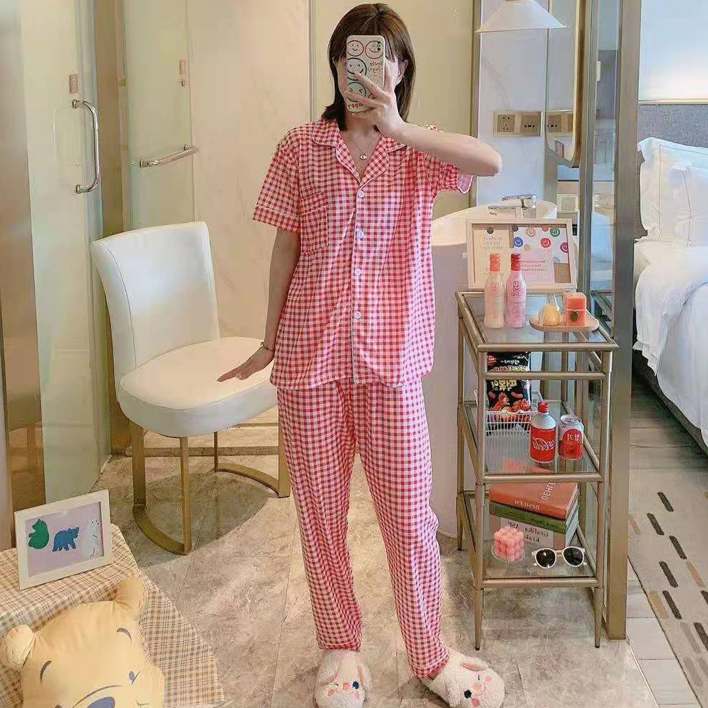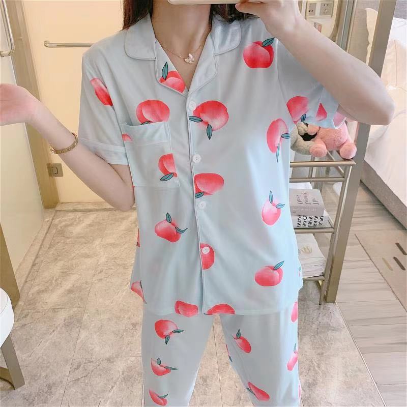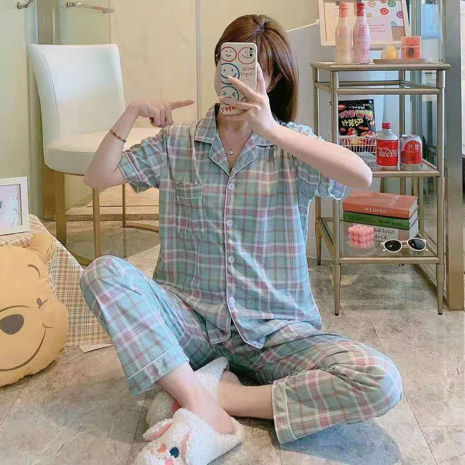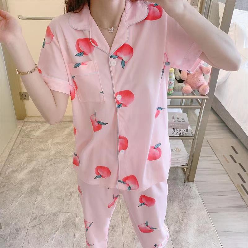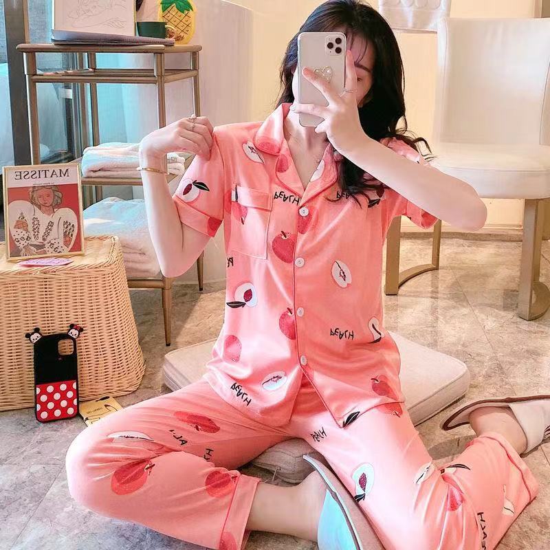 싱글 여름 잠옷 여성용 반팔 바지 카디건 외 발 용품 달콤한 Xueqing 신입생 가정 옷 짧고 긴 세트 한국어 버전스토어 가기