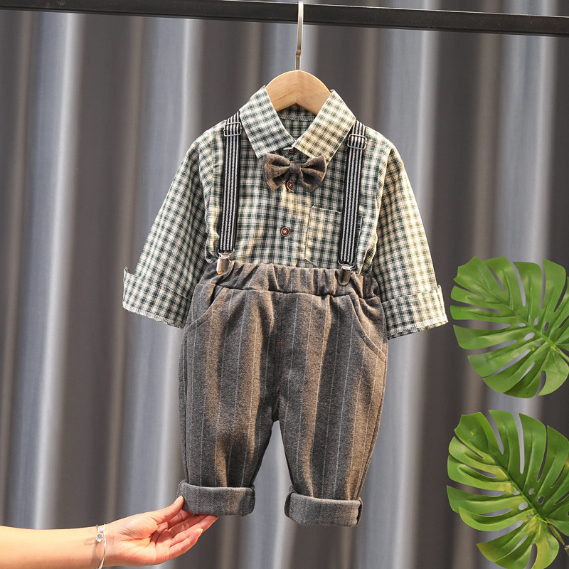 아동복 아기의 격자 무늬 나비 넥타이 스트랩 바지 투피스 세트 소년의 봄 긴팔 세련된 캐주얼 세트 셔츠 유행스토어 가기
