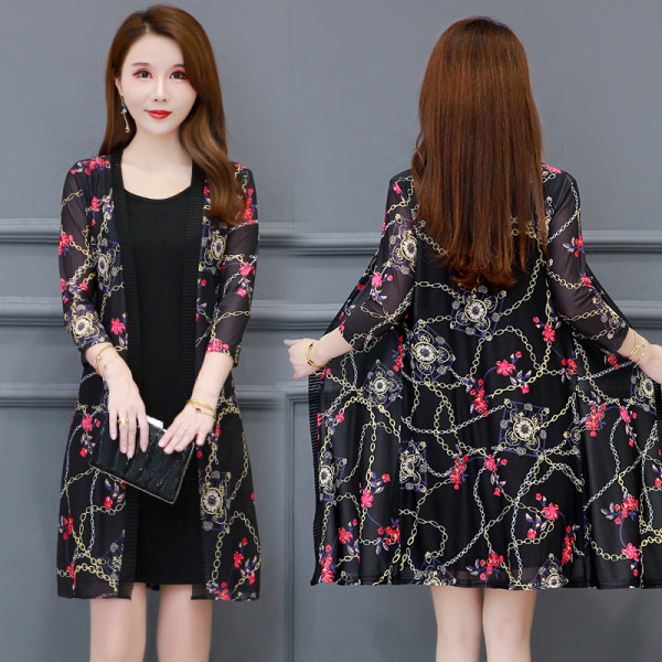 봄과 여름 새로운 플러스 사이즈 여성의 외부 레이스 태양 보호 의류 중간 길이 숄 탑 메쉬 가디건 얇은 코트