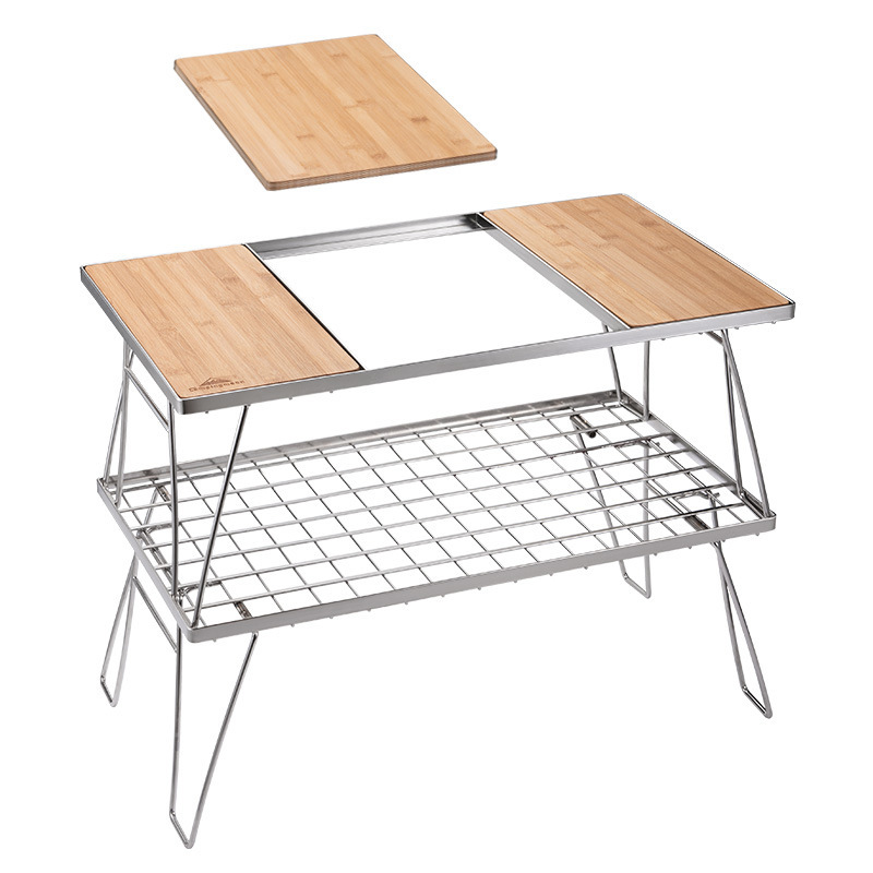 特点:采用不锈钢制作,不易生锈,使用寿命长,中间加P25竹木板可放桌子使用,也可以使用尺寸合适的炉头,变为茶桌。双层可当置物架使用,方便户外收纳整理