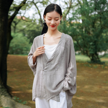 가을 2023 새로운 중국 라미 여성의면과 린넨 셔츠 여성의 디자인 감각 틈새 칼라 셔츠 빈티지