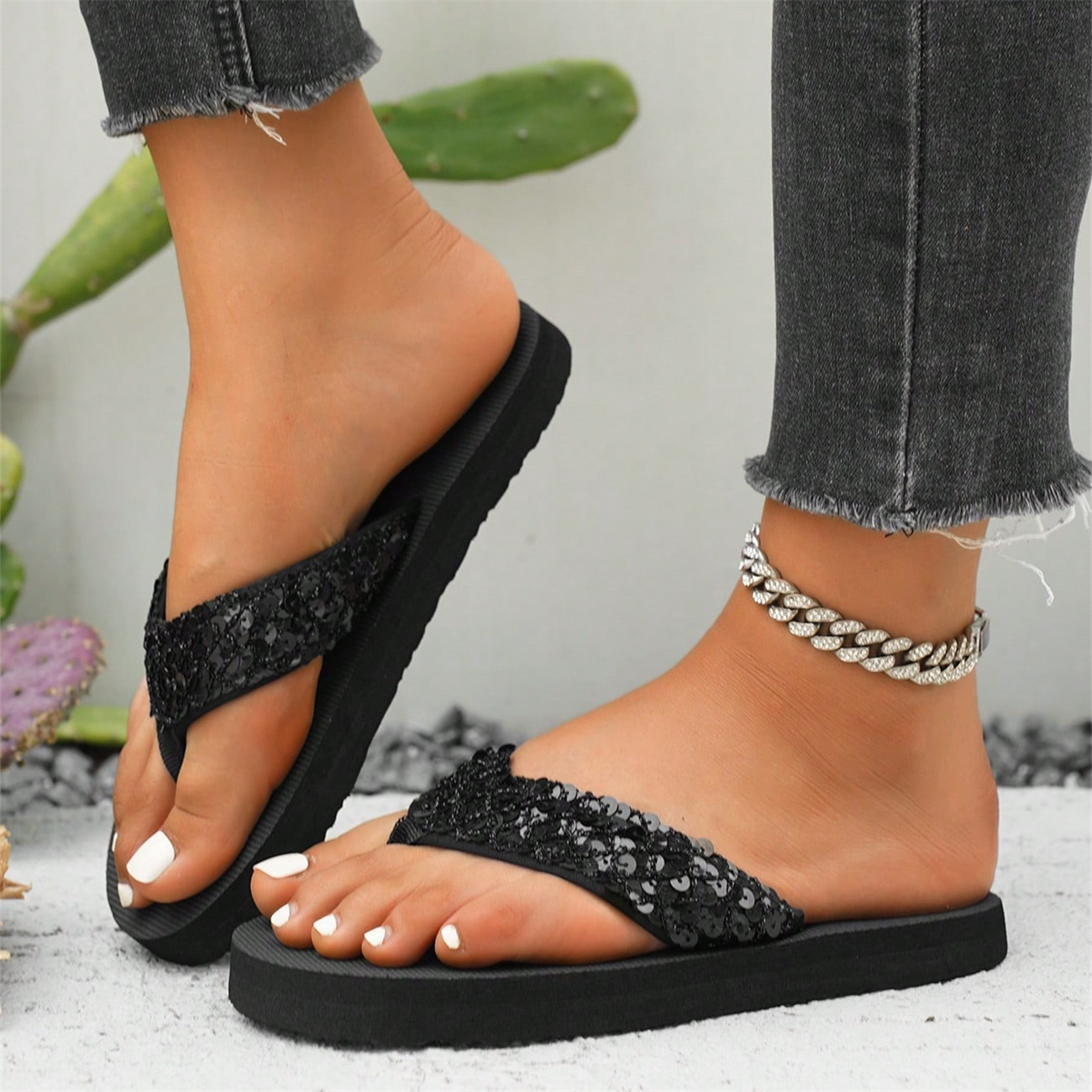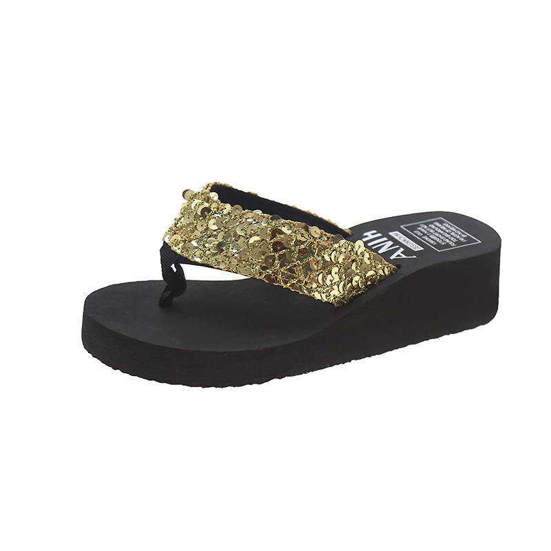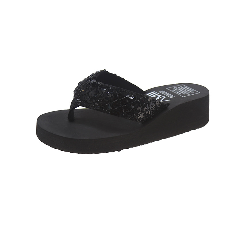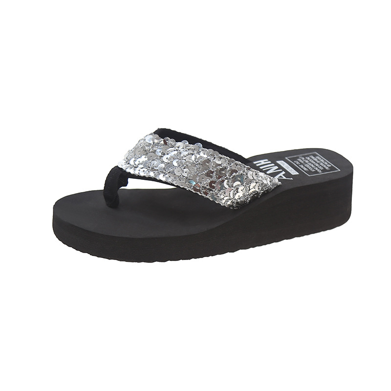 여름 신상 반짝이 슬리퍼 여성 웨지힐 두꺼운 밑창 홈 슬리퍼 비치 슈즈 여성용 반짝이 슬리퍼
