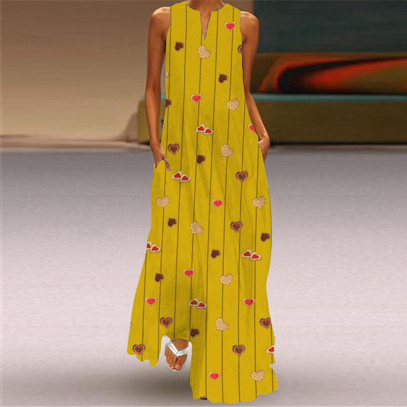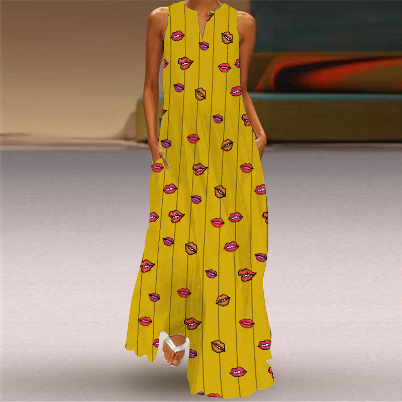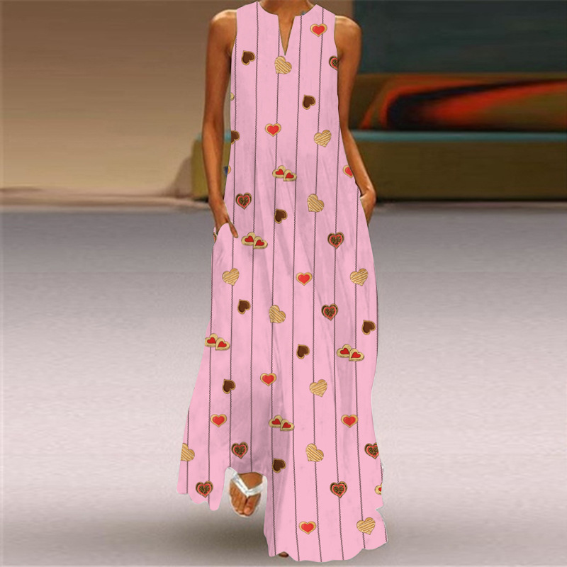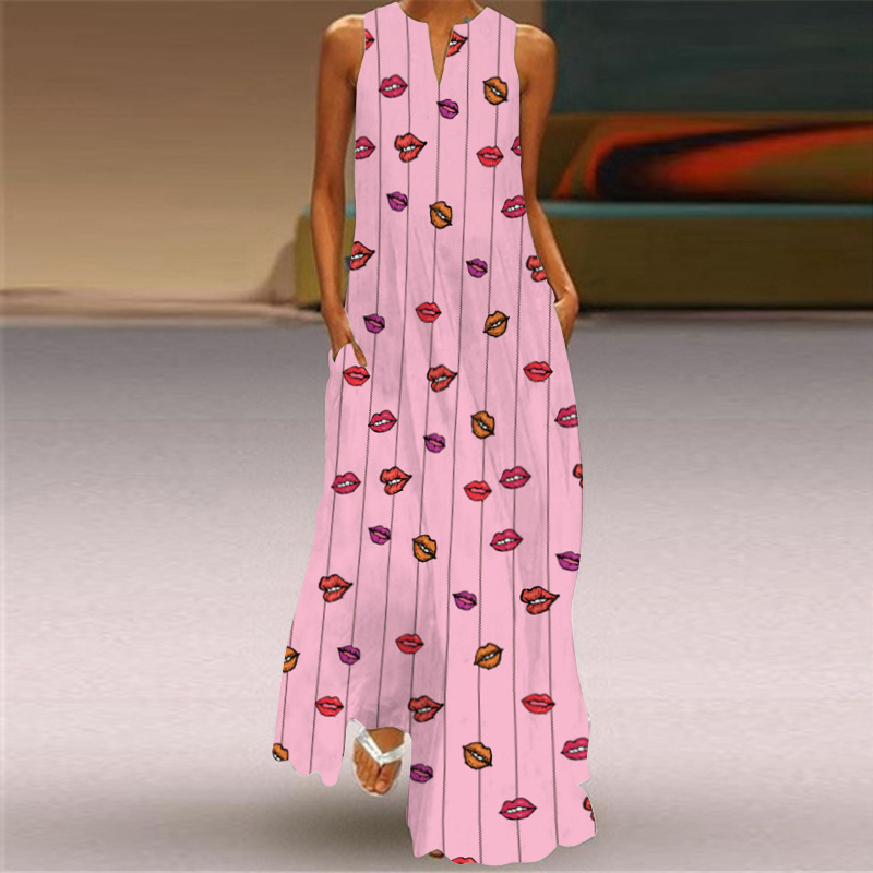 2026년 신상 여름 여성 민소매 롱 드레스 브이넥 프린트 꽃무늬 원피스 유럽 및 미국 해외 무역 여성복