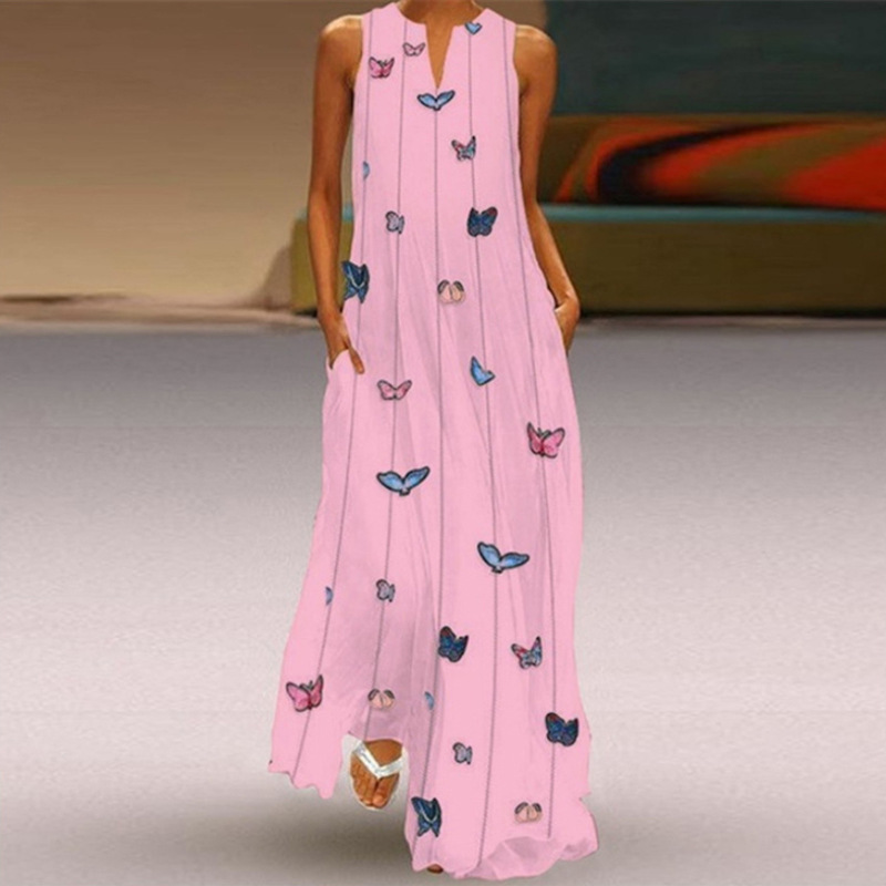 2026년 신상 여름 여성 민소매 롱 드레스 브이넥 프린트 꽃무늬 원피스 유럽 및 미국 해외 무역 여성복스토어 가기
