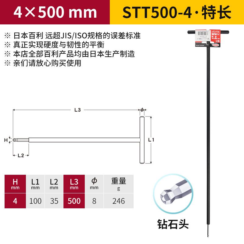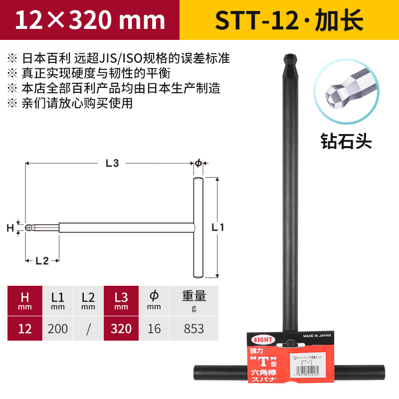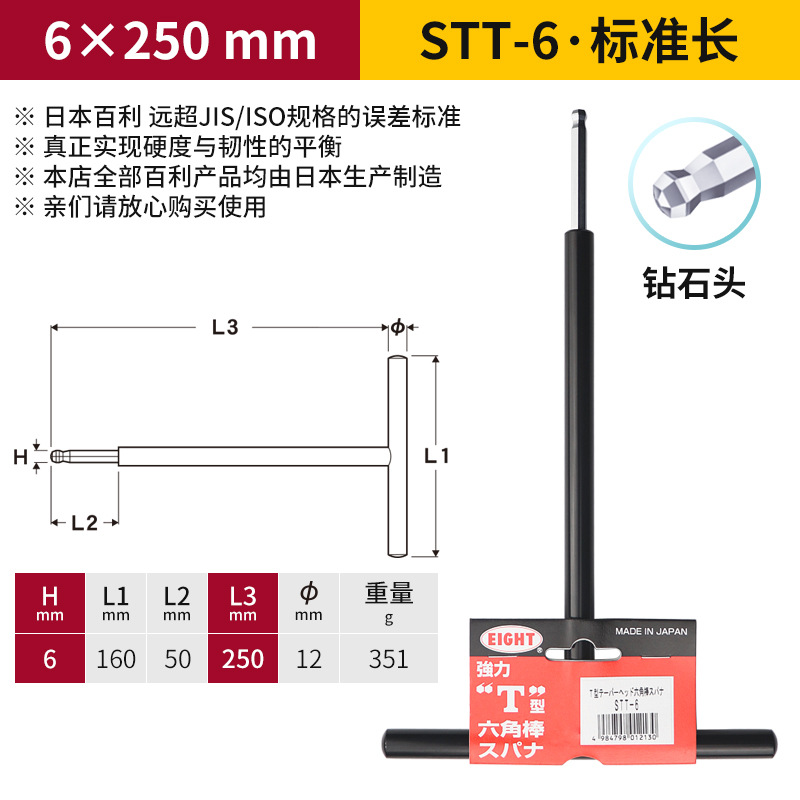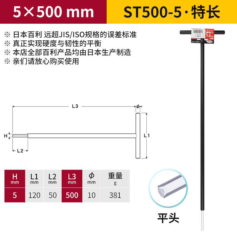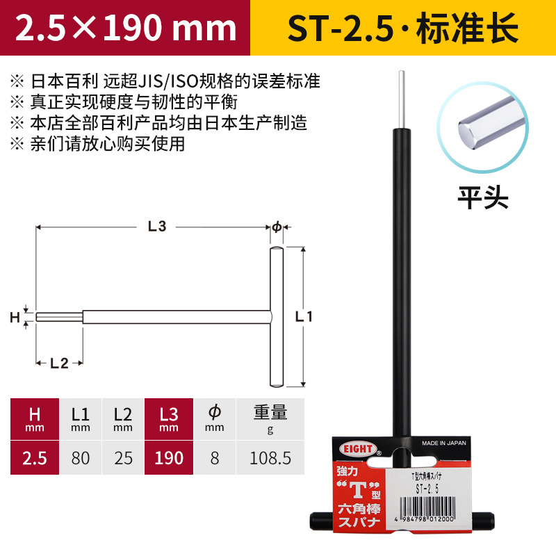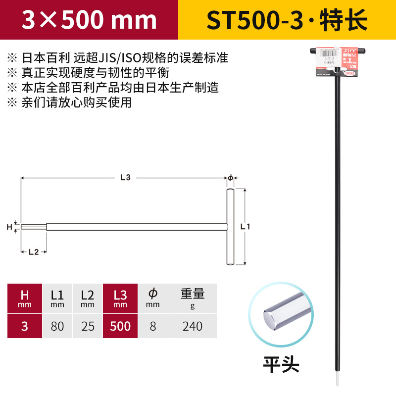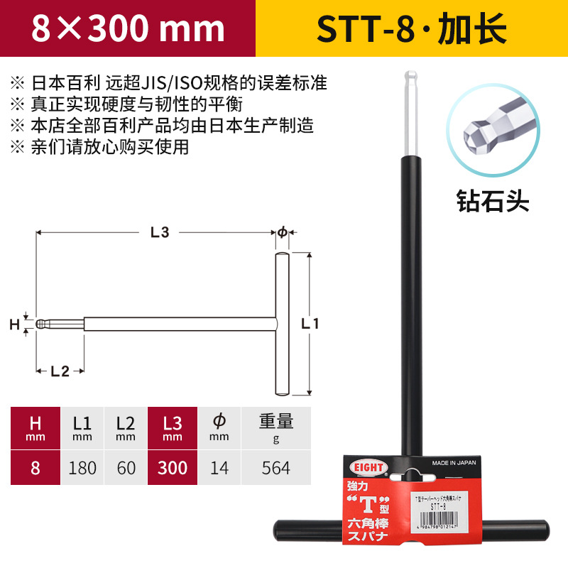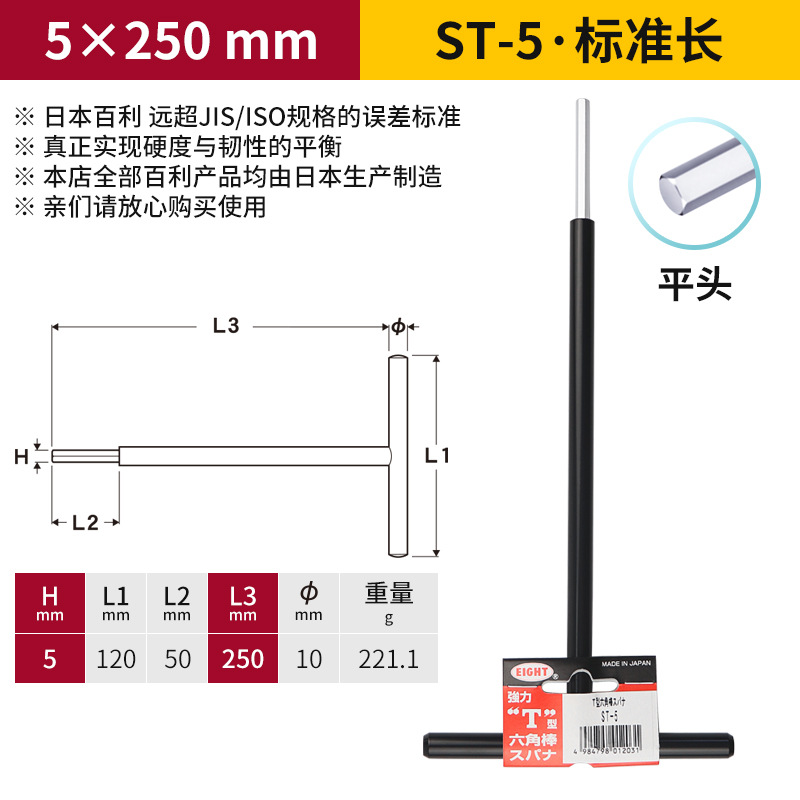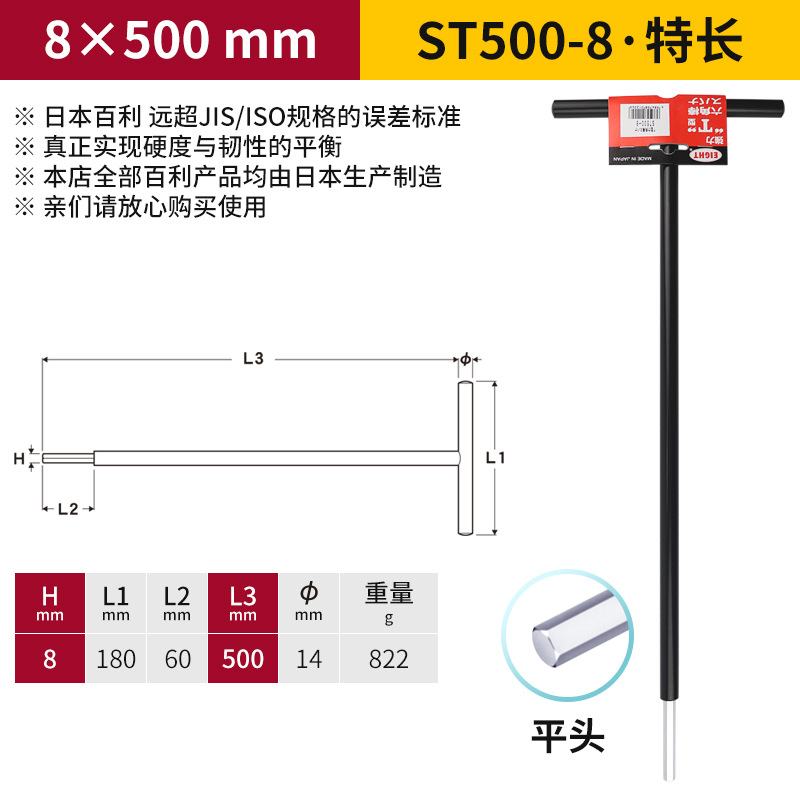일본 EIGHT Baili T 자형 볼 소켓 렌치 금속 철 손잡이 플랫 헤드 여분의 긴 육각형 키스토어 가기