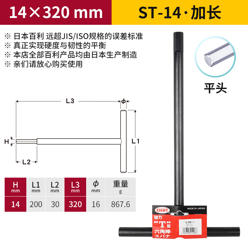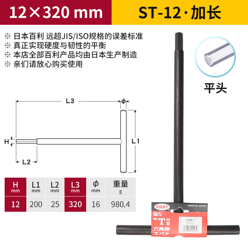 일본 EIGHT Baili T 자형 볼 소켓 렌치 금속 철 손잡이 플랫 헤드 여분의 긴 육각형 키