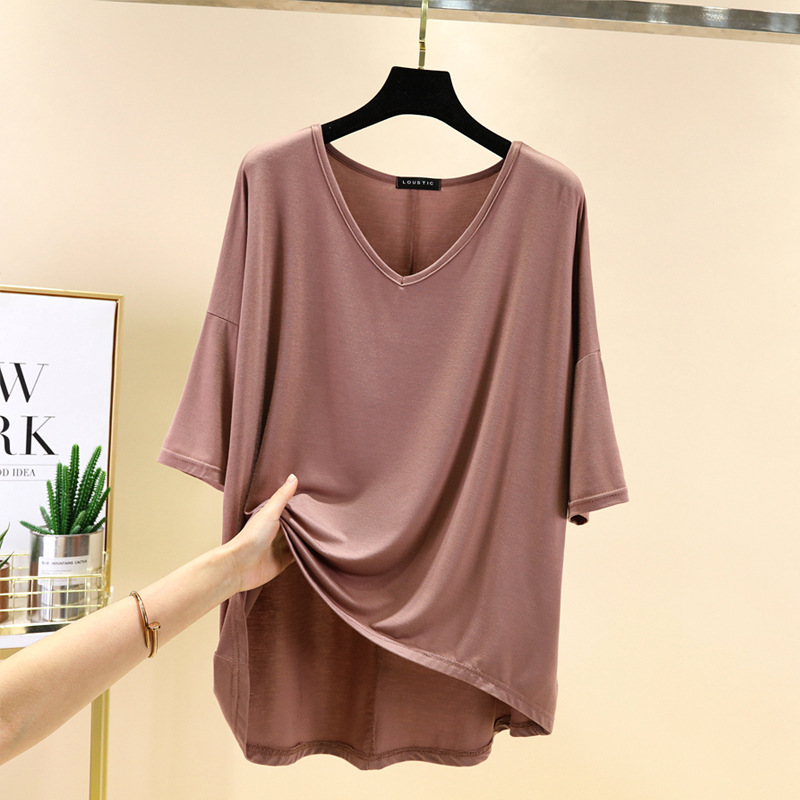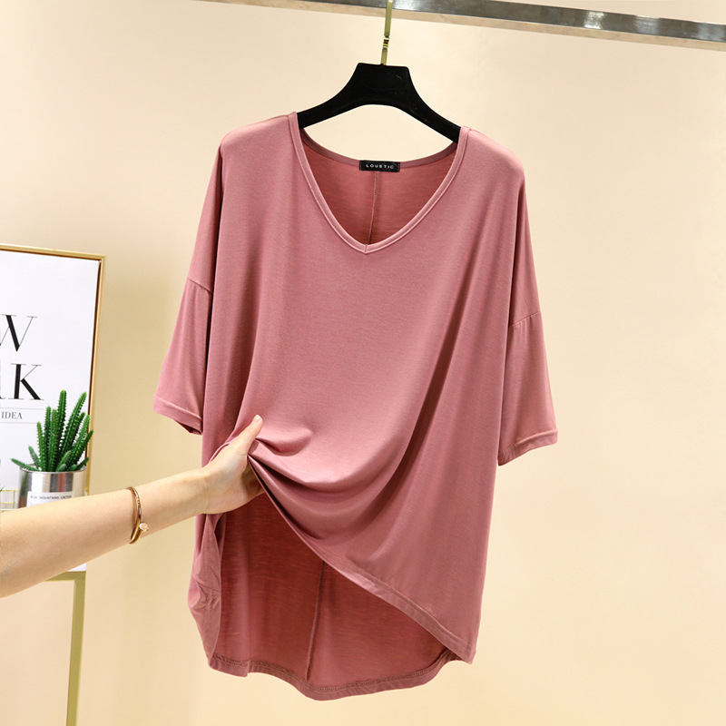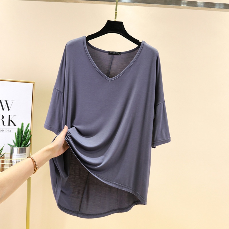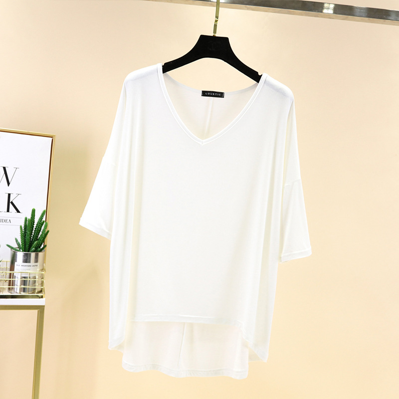 느슨한 티셔츠 여성의 봄과 여름 모달 플러스 사이즈 슬리밍 V-넥 반팔 상부 의류 불규칙한 유럽과 미국 반 소매 여성 의류스토어 가기