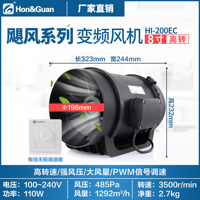 • 8 인치 HI-200EC(3500 rpm) * 무단 속도 조절 스위치 * 가변 주파수 파이프라인 팬
