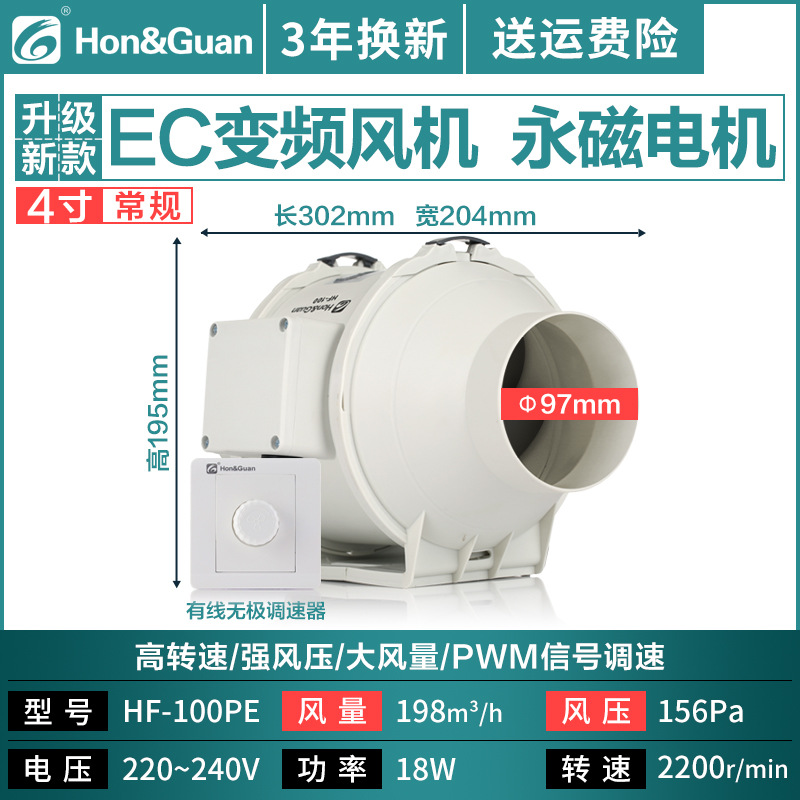 • 4 인치 HF-100PE(3800 rpm) * 무단 속도 조절 스위치 * 주파수 변환 파이프라인 팬