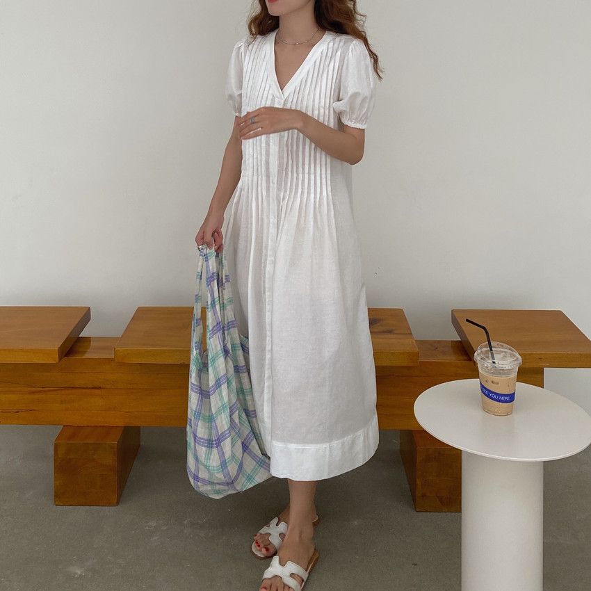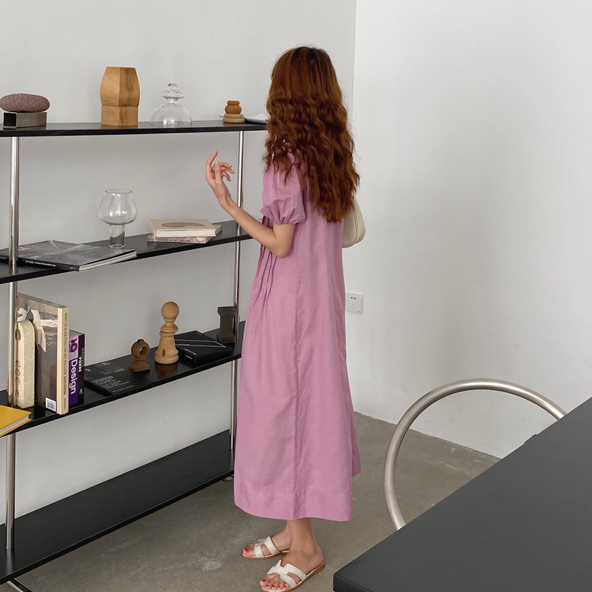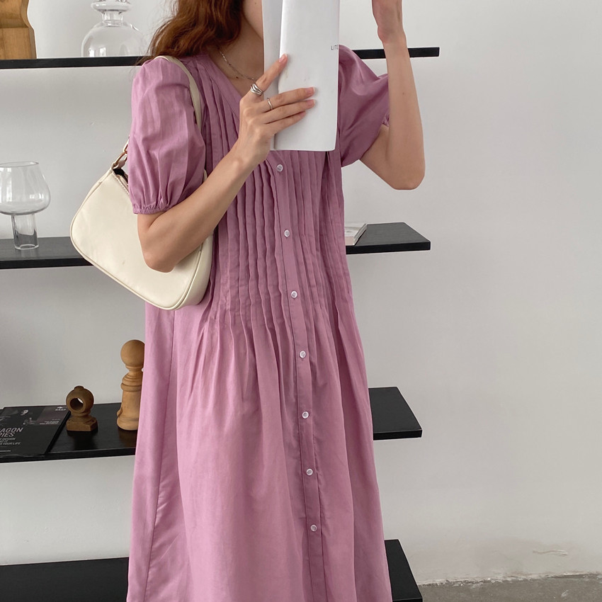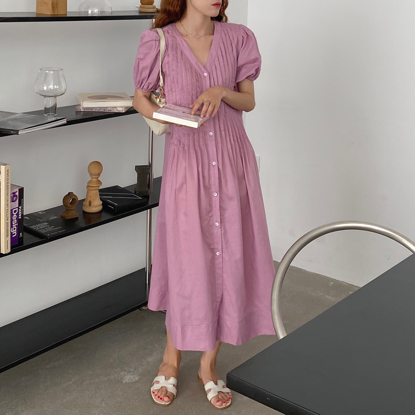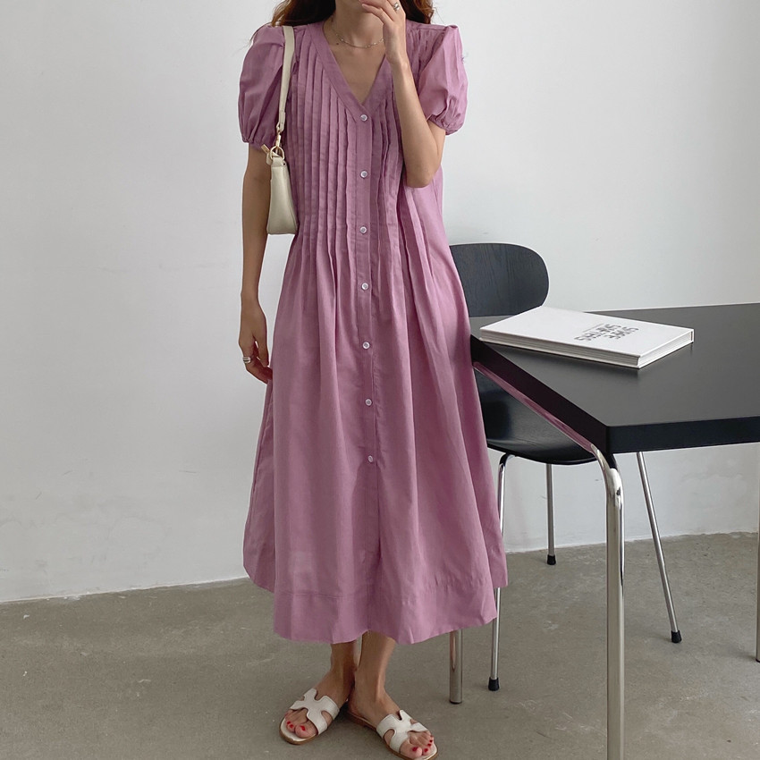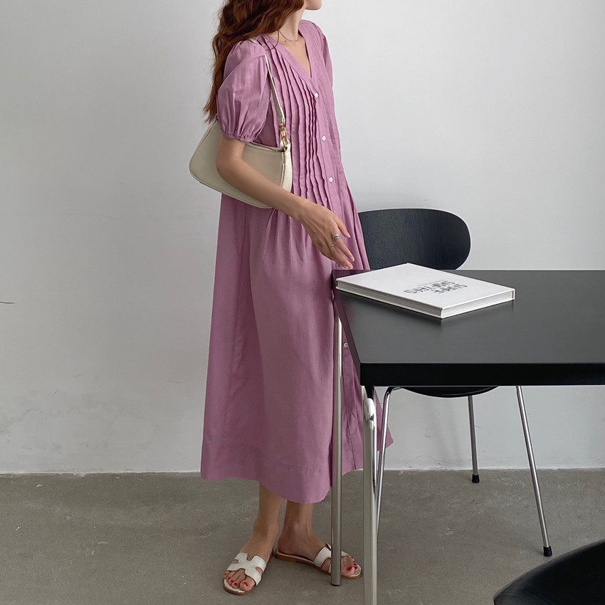 게으른 핑크와 퍼플의 실제 사진 ~ 중공업 플리츠 브이넥 자외선 차단 셔츠 드레스 여성용 퍼프 슬리브 드레스 3 색스토어 가기