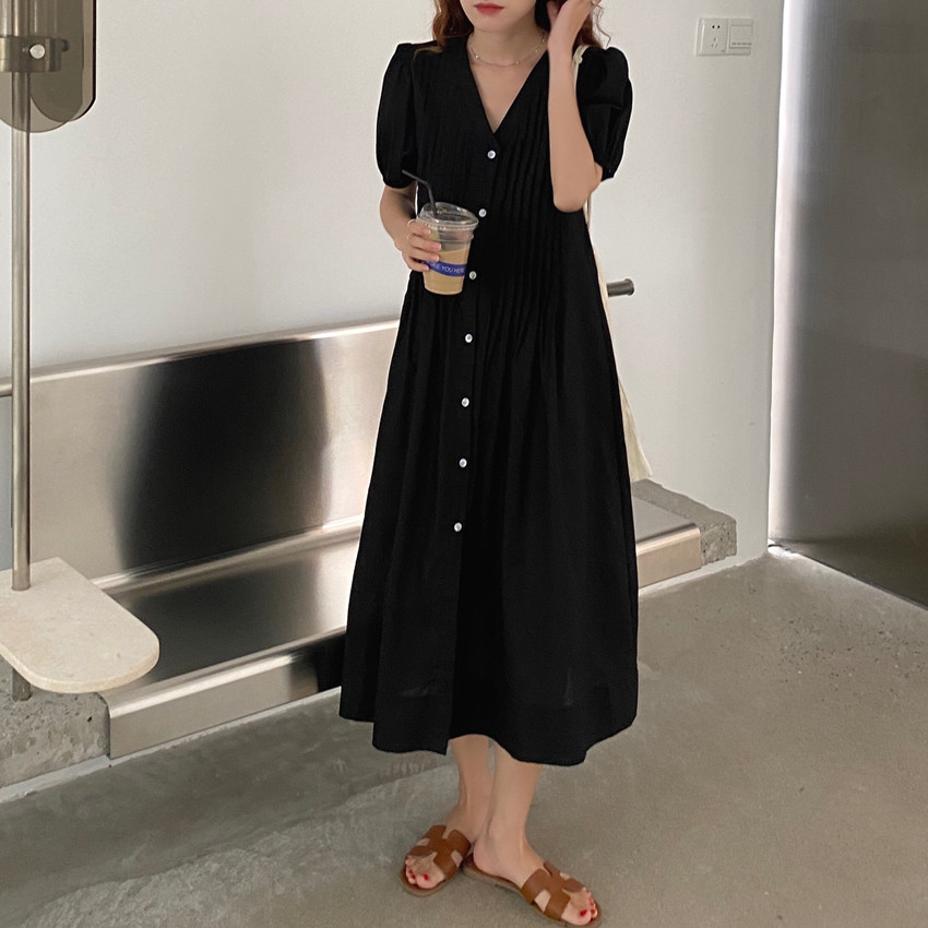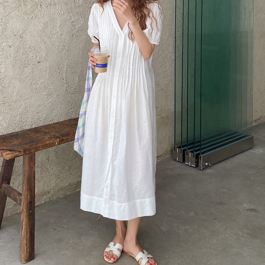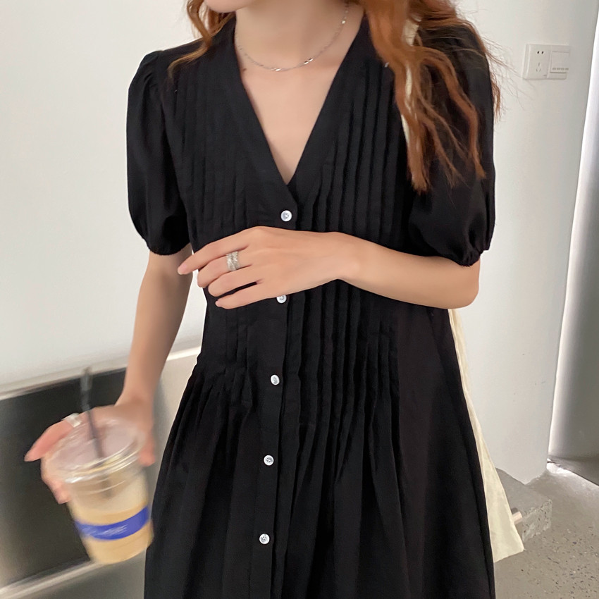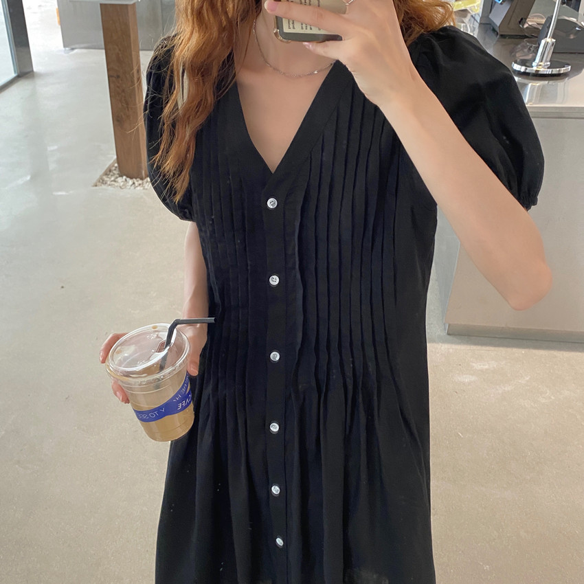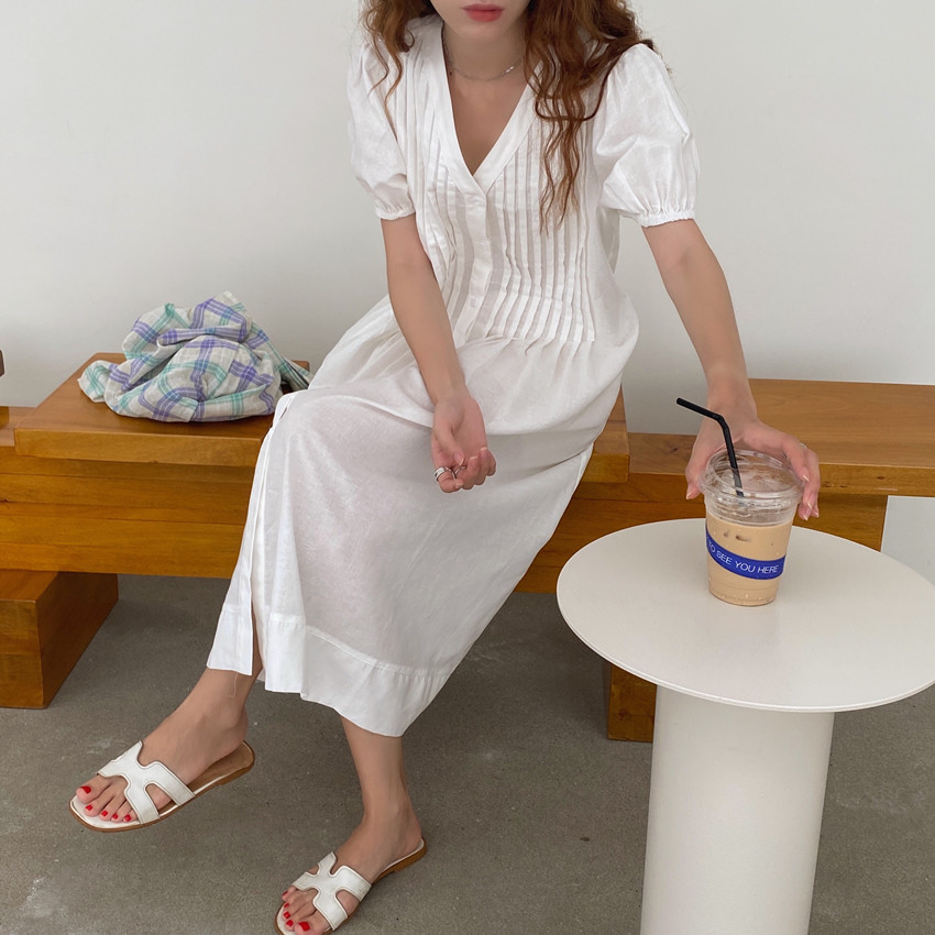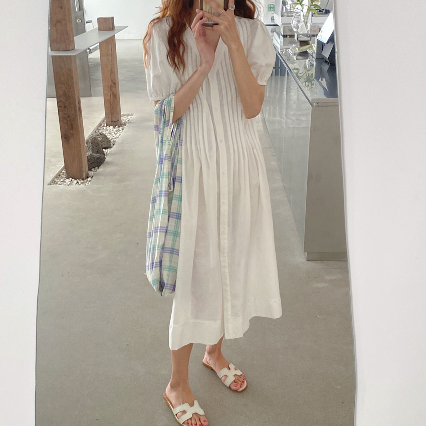 게으른 핑크와 퍼플의 실제 사진 ~ 중공업 플리츠 브이넥 자외선 차단 셔츠 드레스 여성용 퍼프 슬리브 드레스 3 색스토어 가기