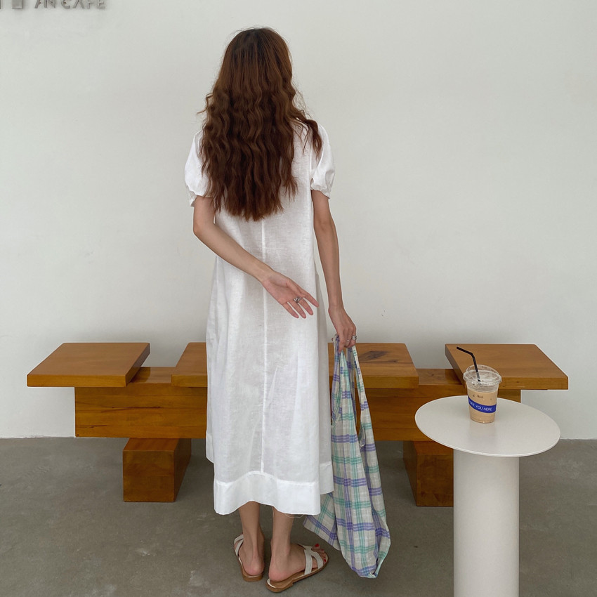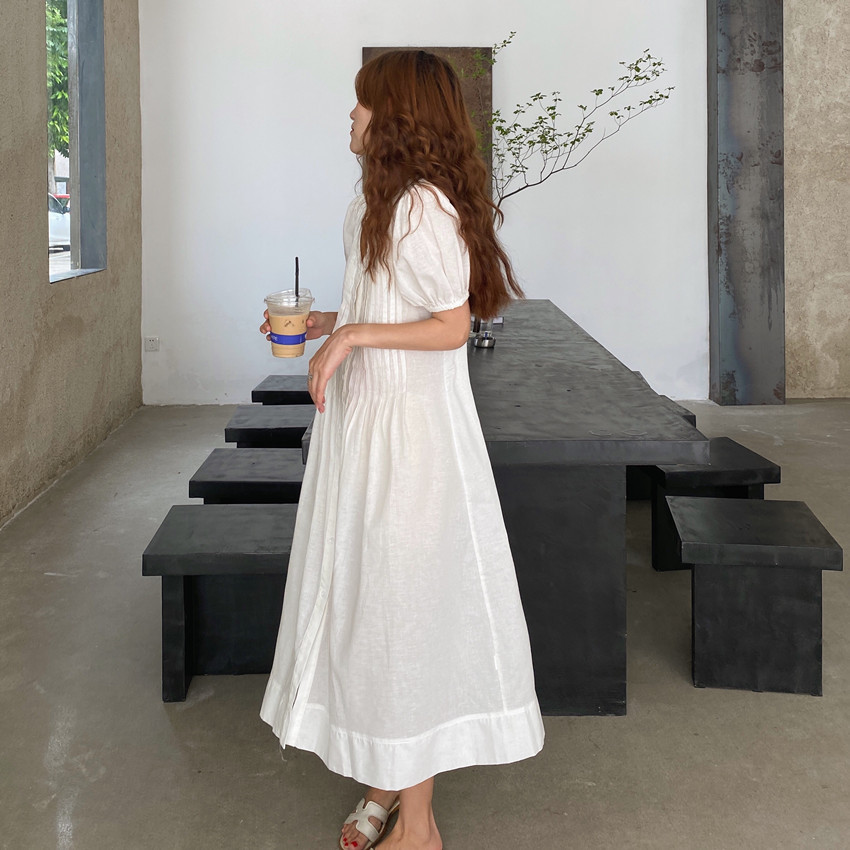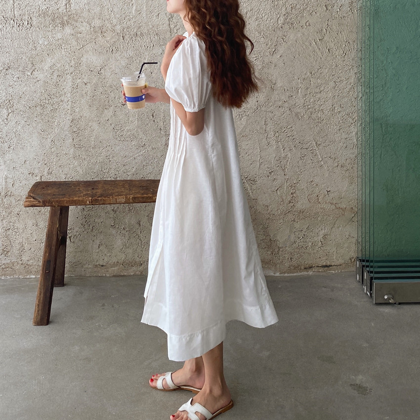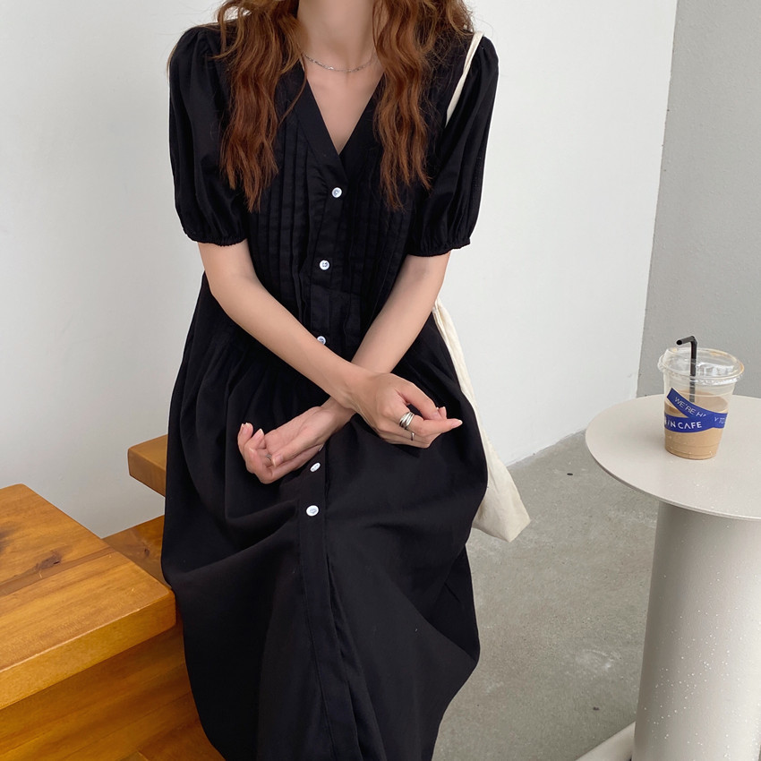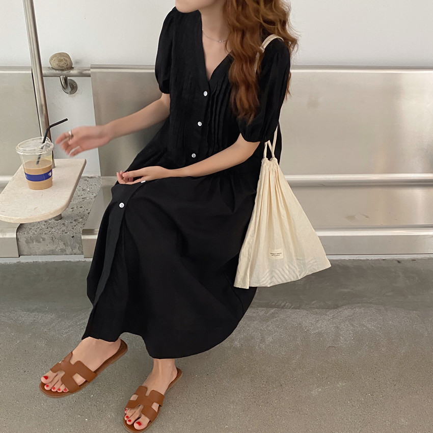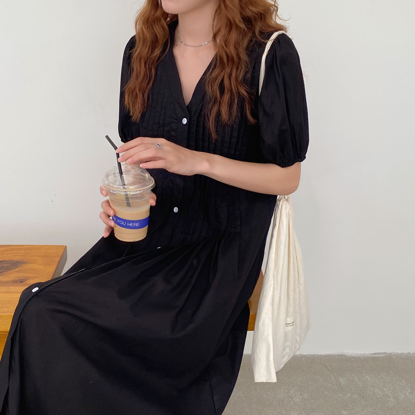 게으른 핑크와 퍼플의 실제 사진 ~ 중공업 플리츠 브이넥 자외선 차단 셔츠 드레스 여성용 퍼프 슬리브 드레스 3 색스토어 가기
