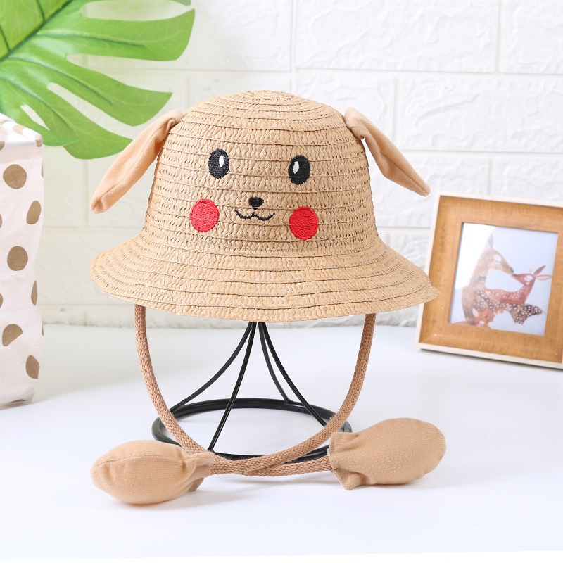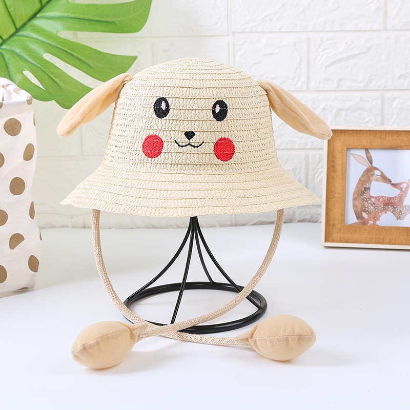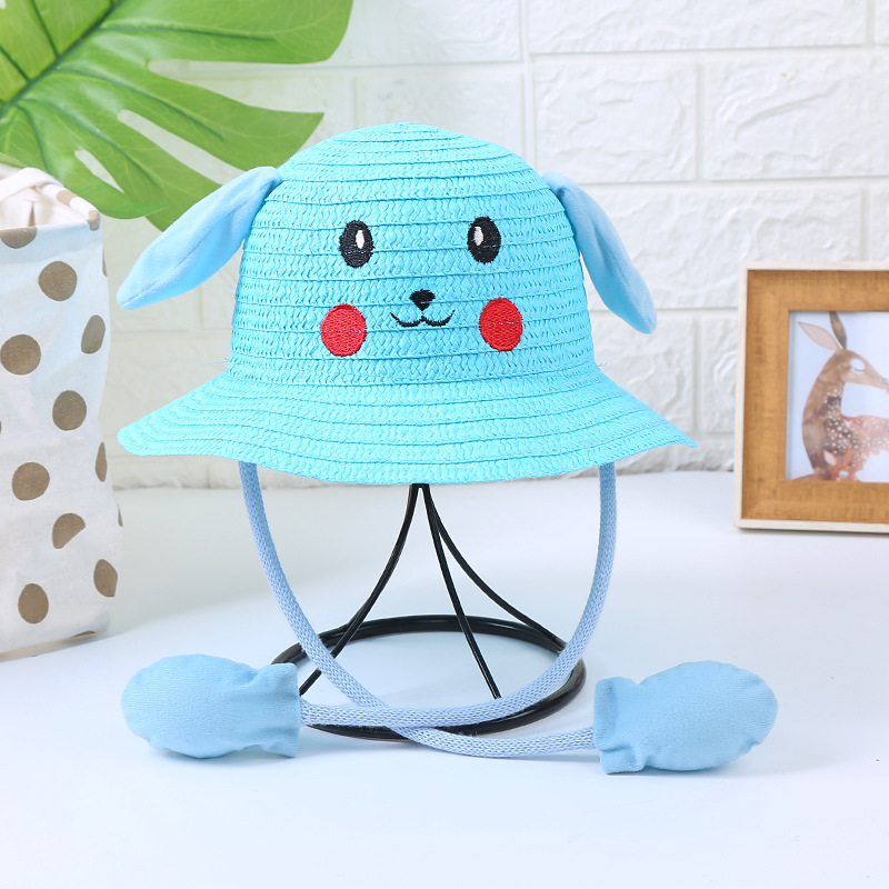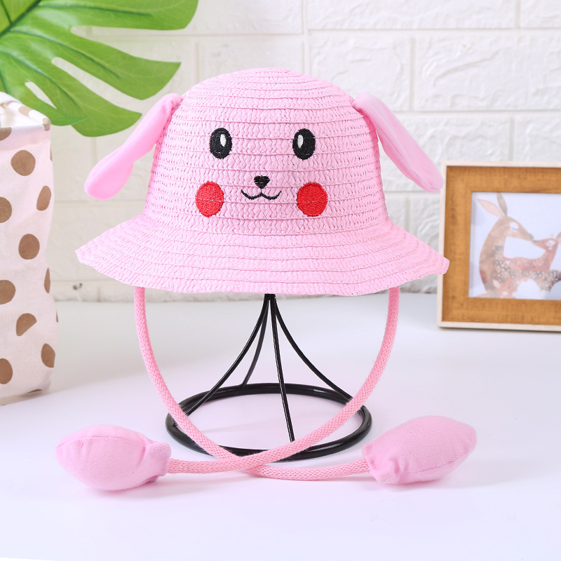 어린이 밀짚 모자 여름 자외선 차단제 태양 모자 귀여운 피카츄 귀 움직일 수있는 토끼 모자 야외 관광 명소
