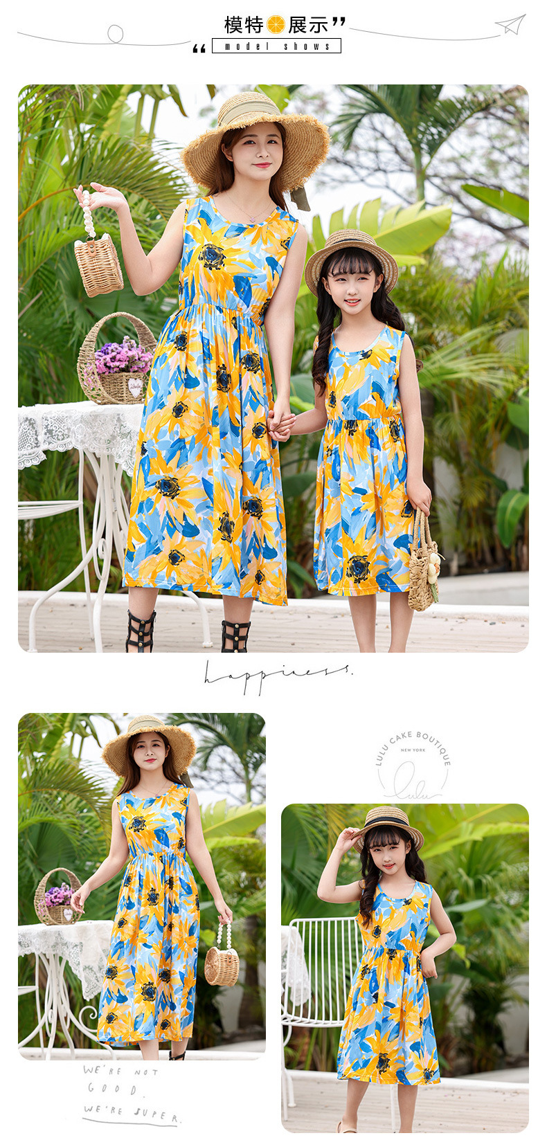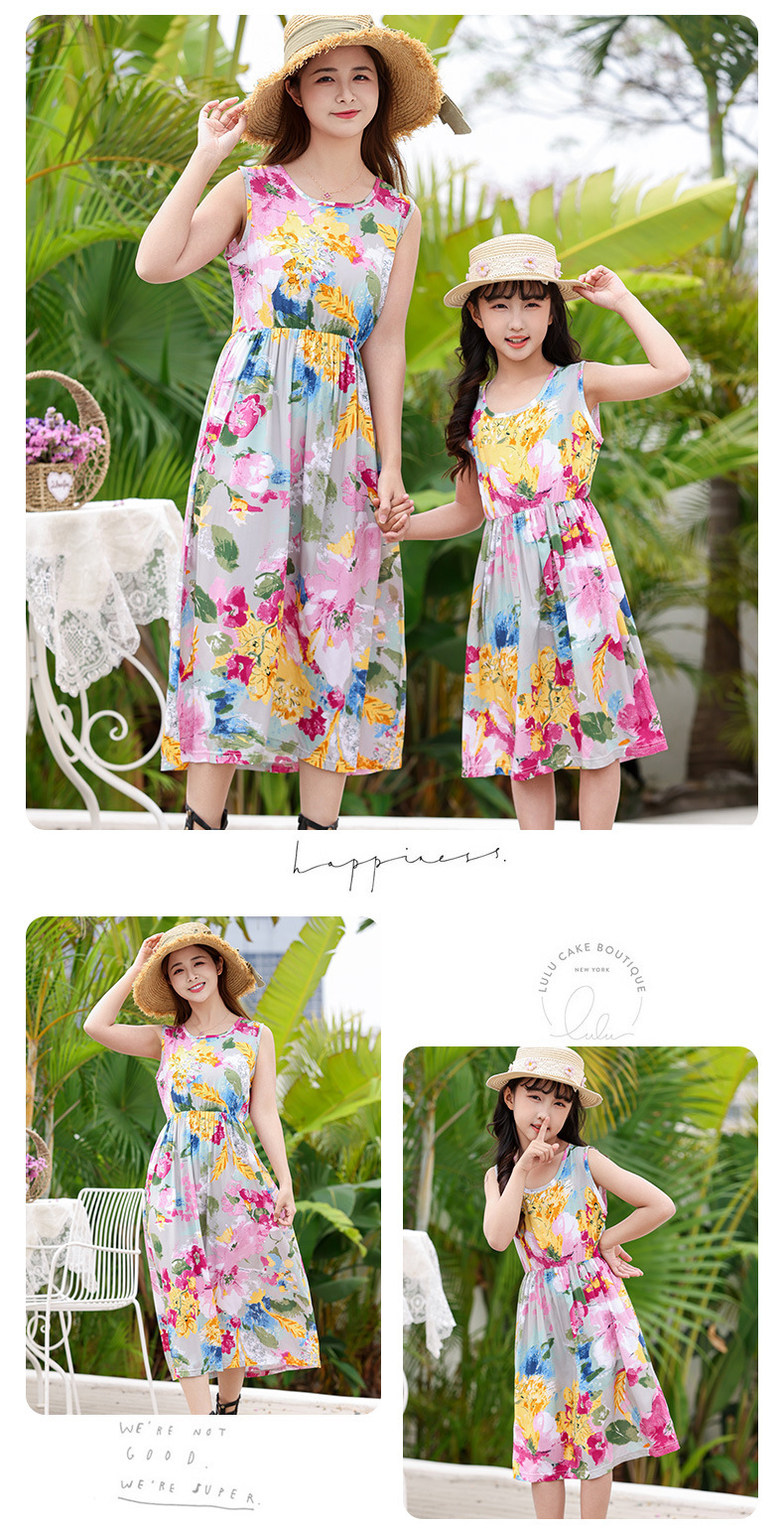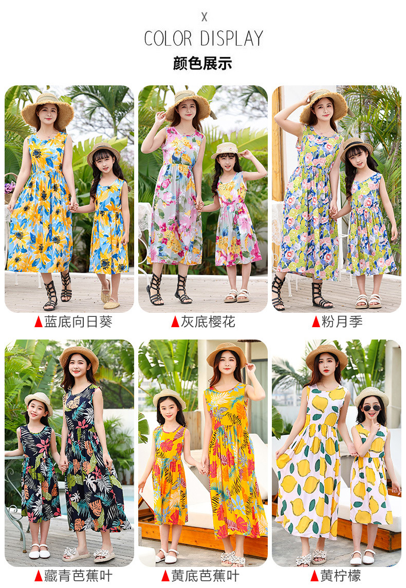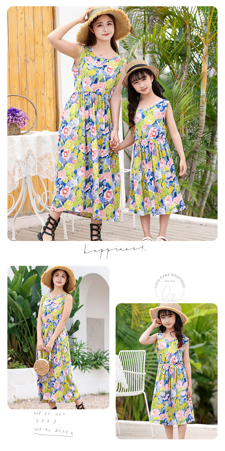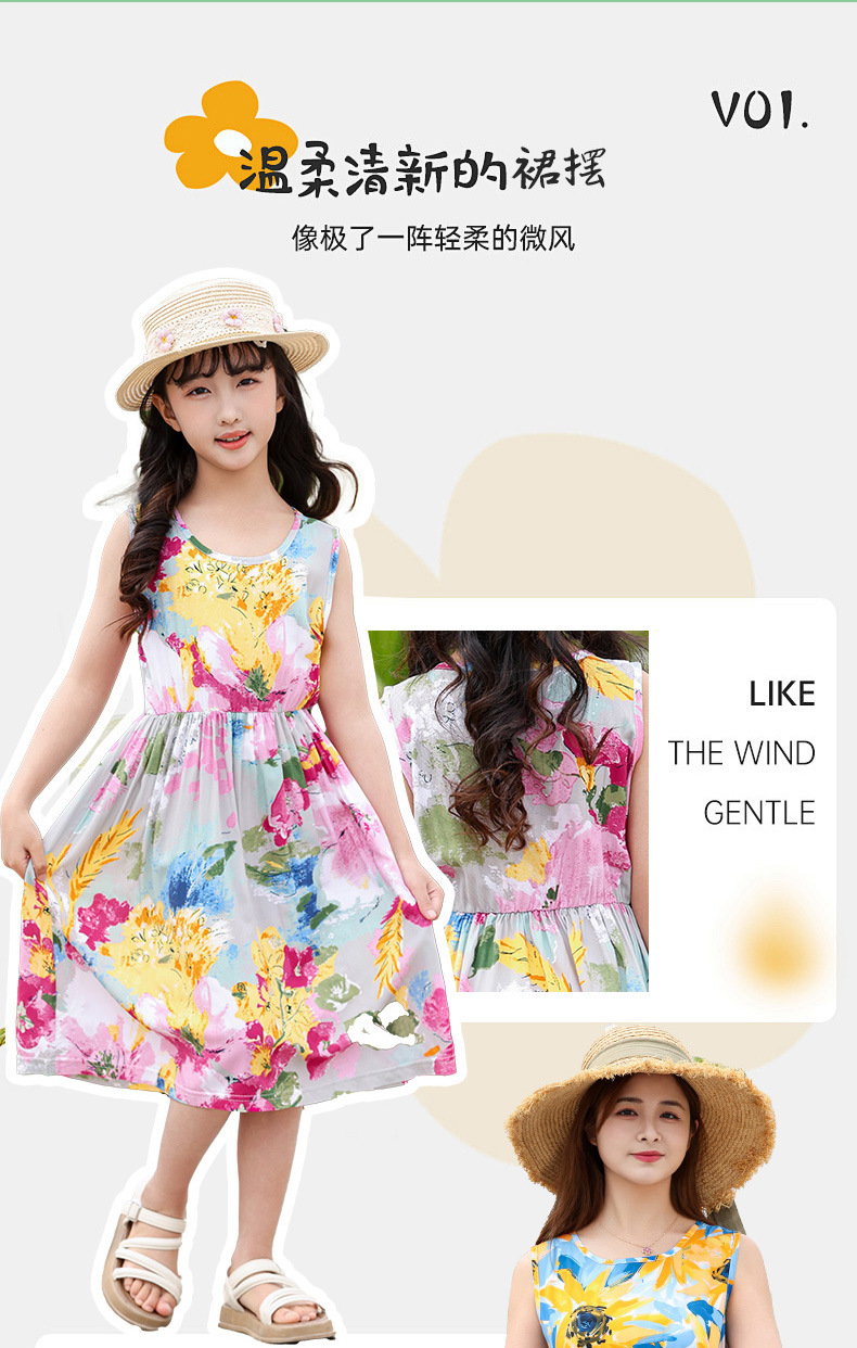 2025 여름 부모-자녀 원피스 어머니와 딸 달콤한 인쇄 비치 원피스 큰 아이 멋진 통기성 느슨한 조끼 원피스스토어 가기