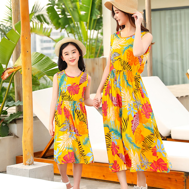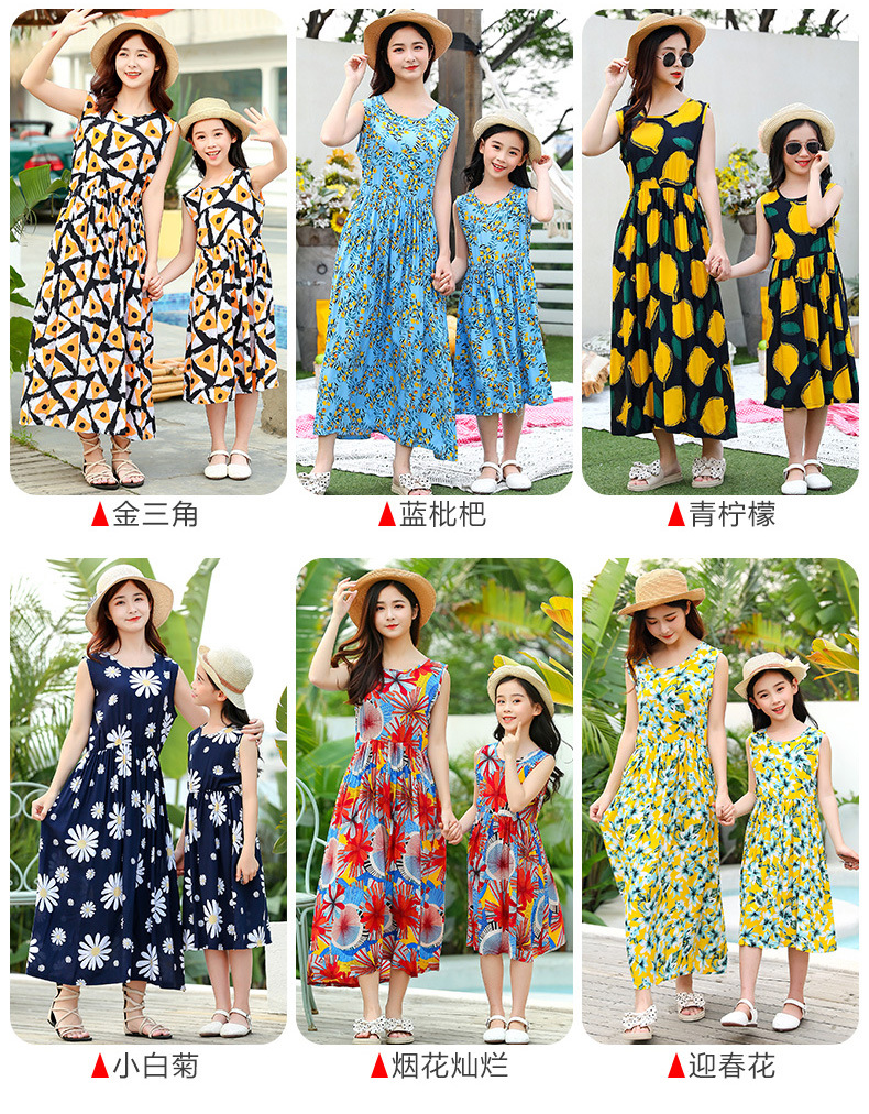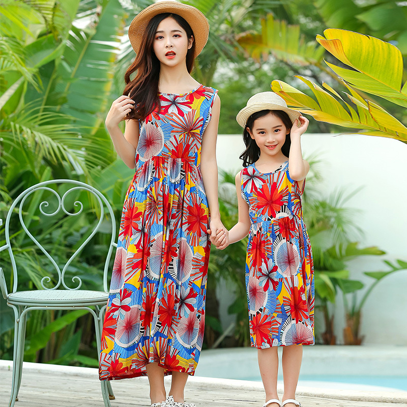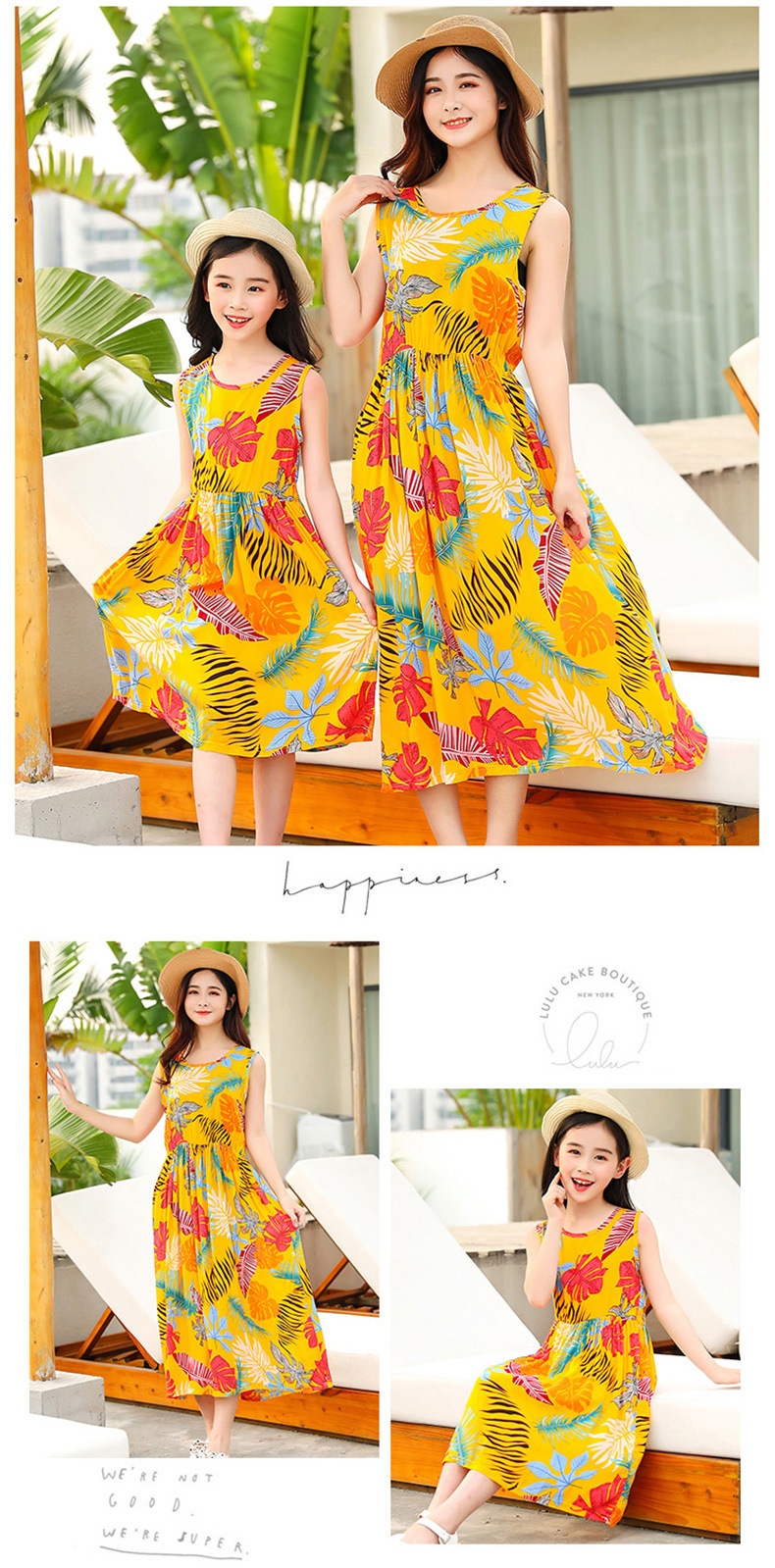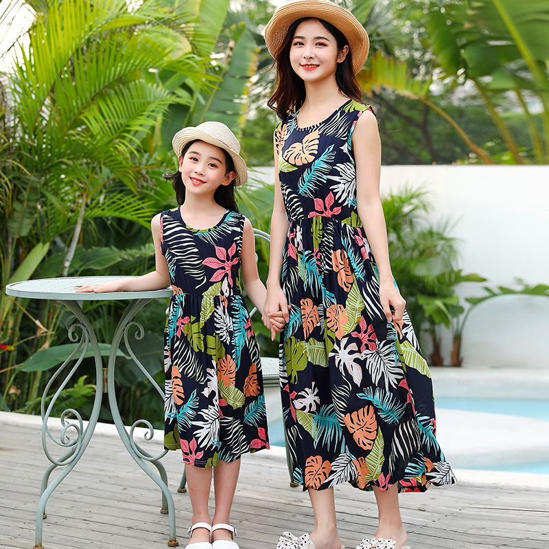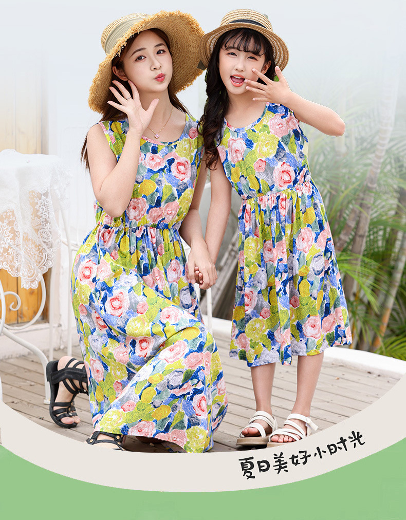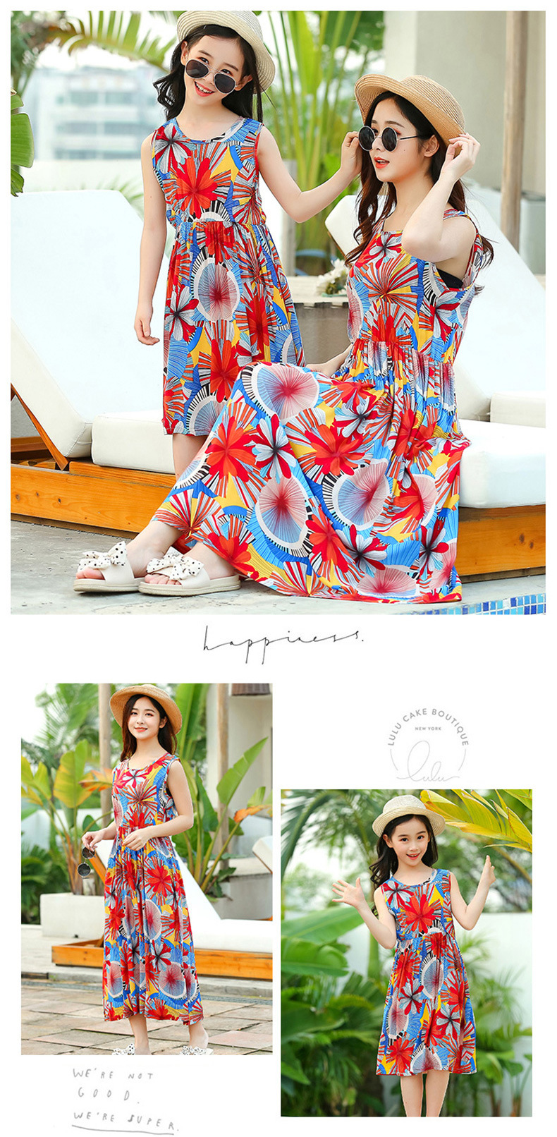 2025 여름 부모-자녀 원피스 어머니와 딸 달콤한 인쇄 비치 원피스 큰 아이 멋진 통기성 느슨한 조끼 원피스스토어 가기