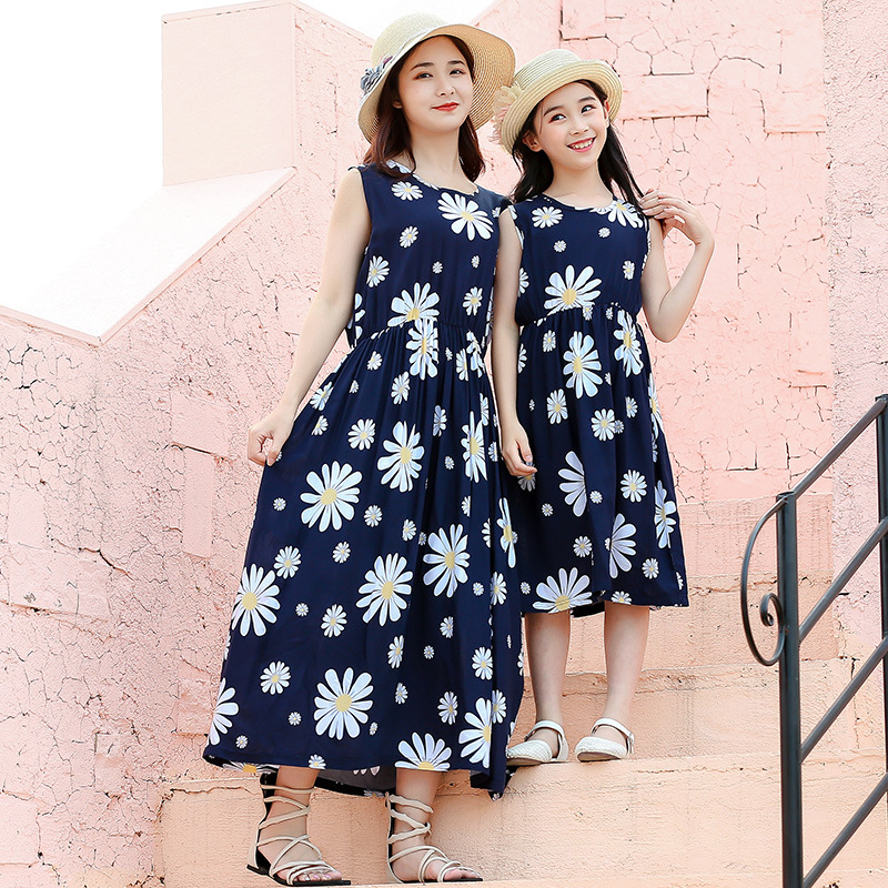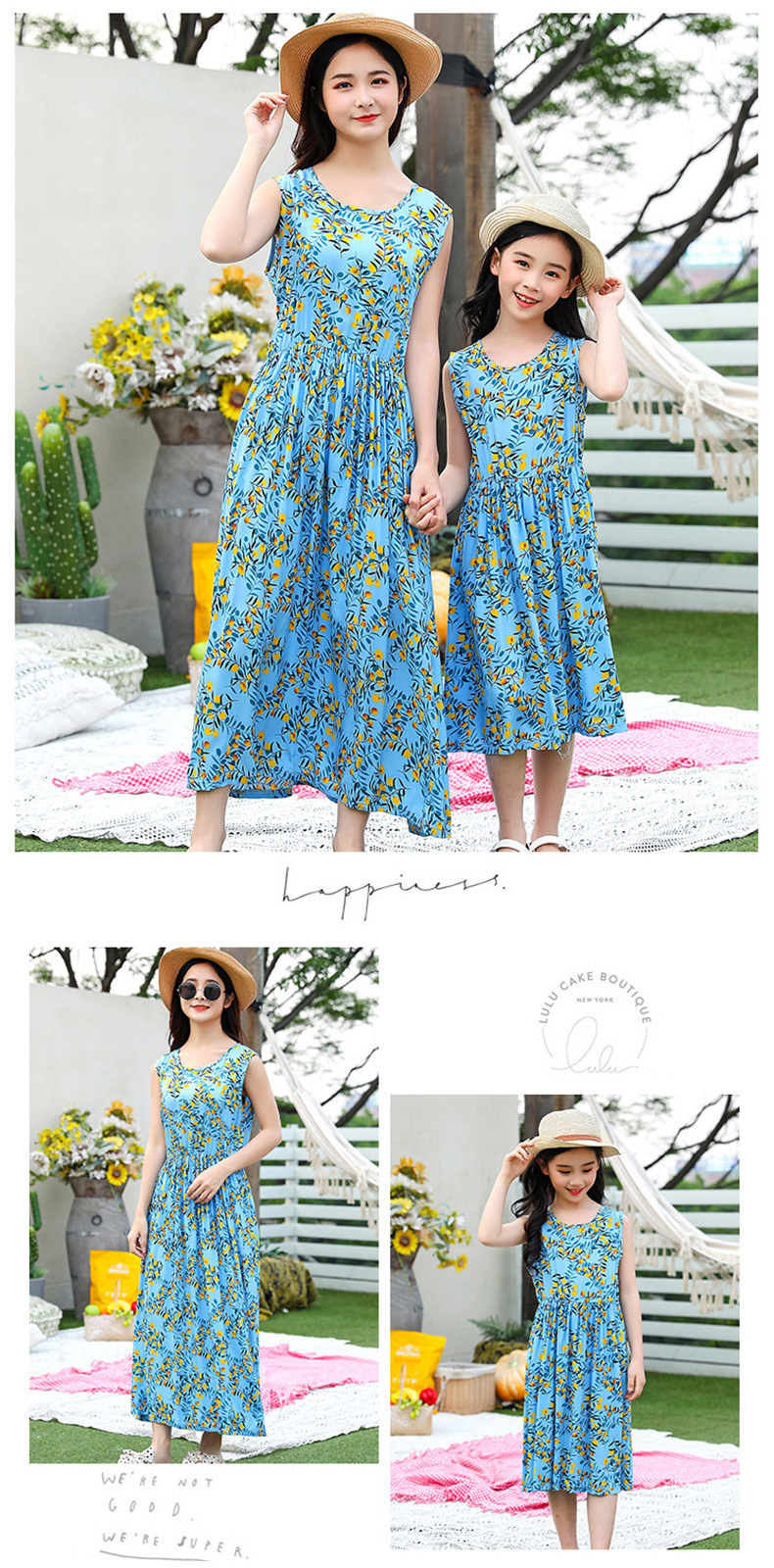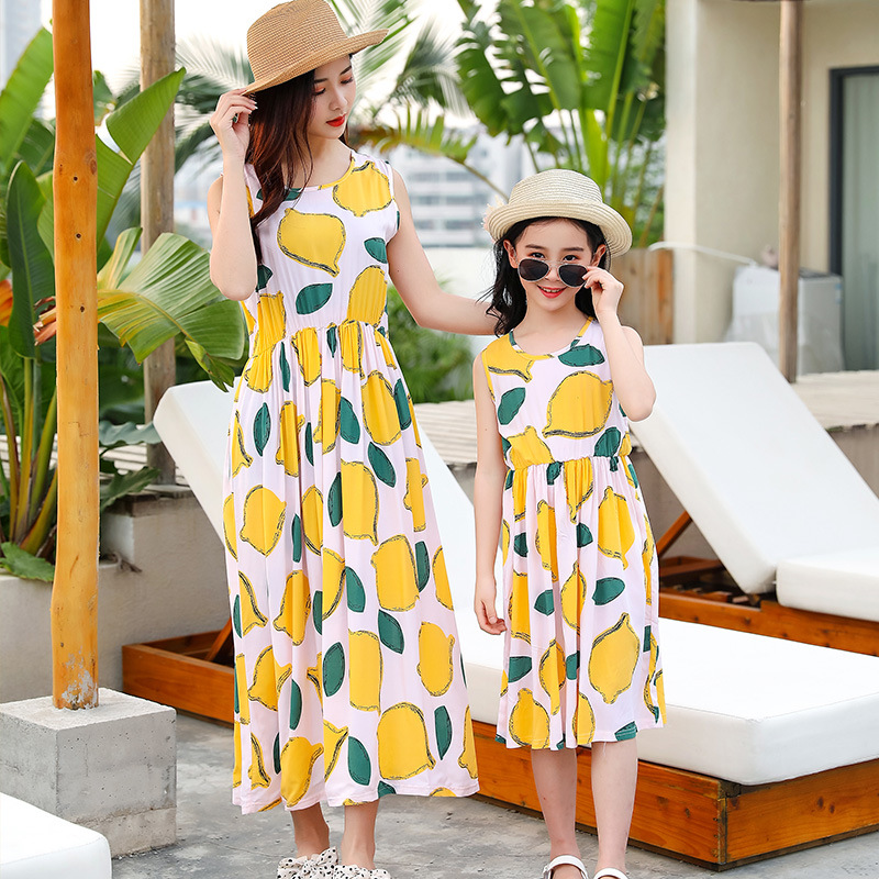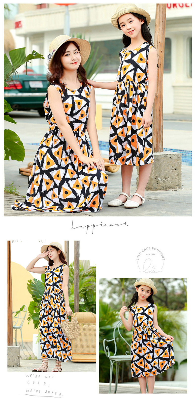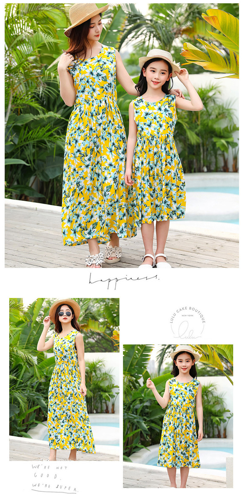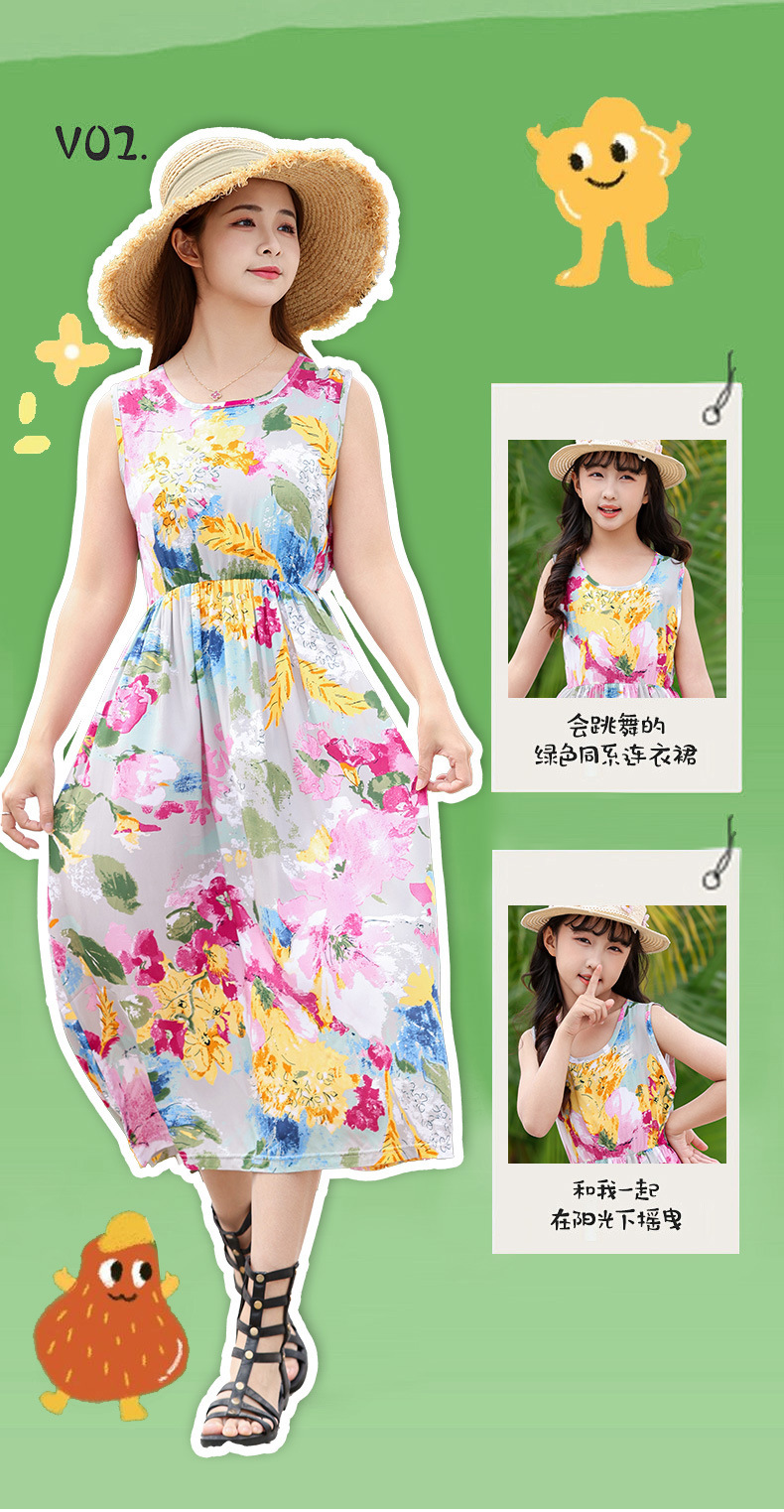 2025 여름 부모-자녀 원피스 어머니와 딸 달콤한 인쇄 비치 원피스 큰 아이 멋진 통기성 느슨한 조끼 원피스스토어 가기