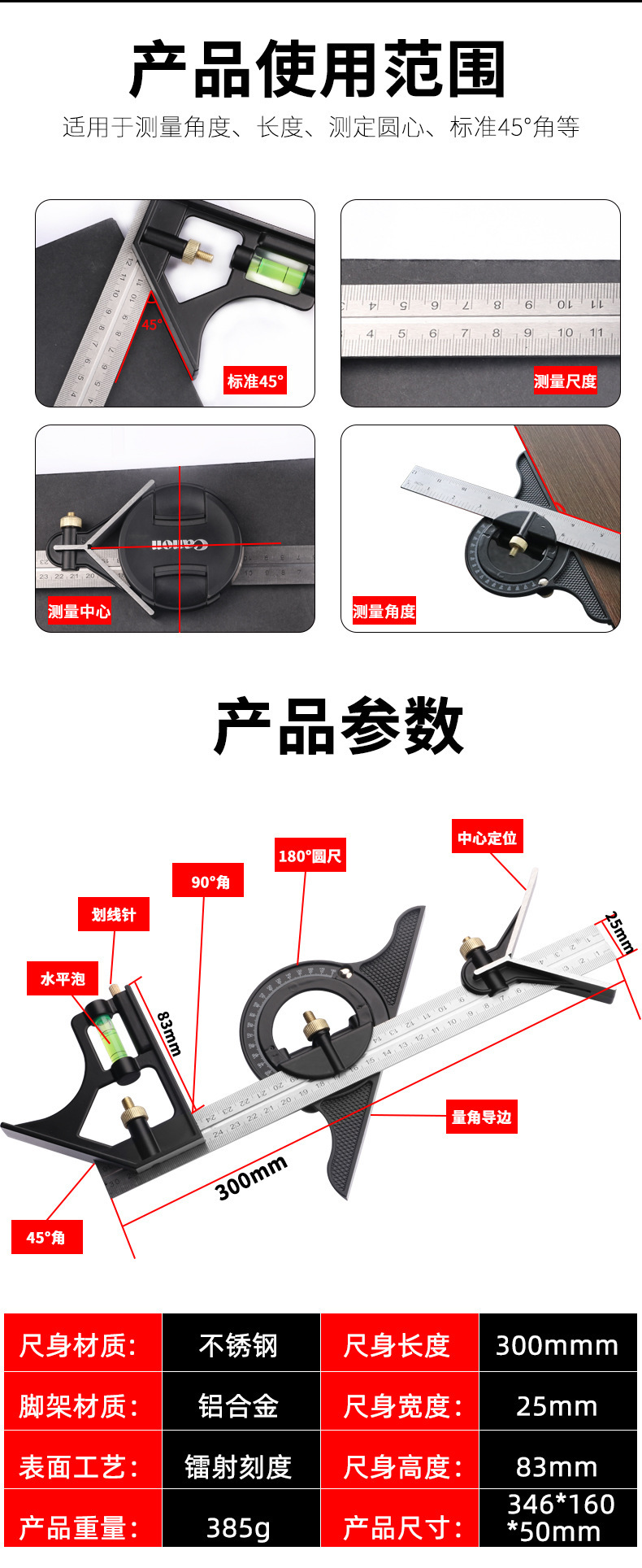 이동식 각도 눈금자 300mm 스테인레스 스틸 다기능 수평 직선 각도 눈금자 목공 다도 고정밀 조합 각도 눈금자스토어 가기