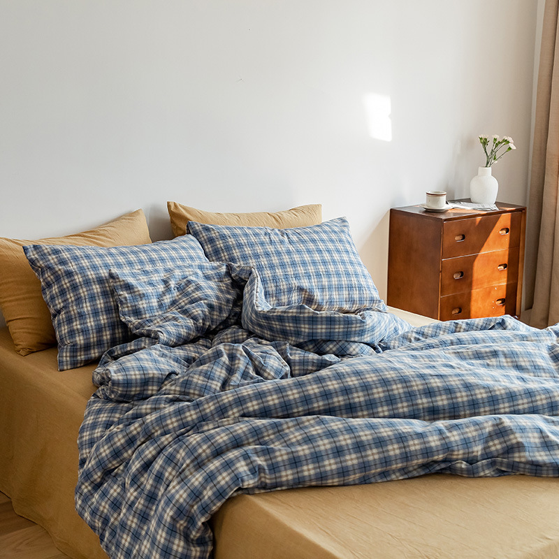 코튼 원사 염색 워시 코튼 4 피스 세트 레트로 3 색 격자 무늬 코튼 3 피스 세트 간단한 침대 시트 키트