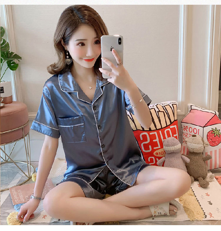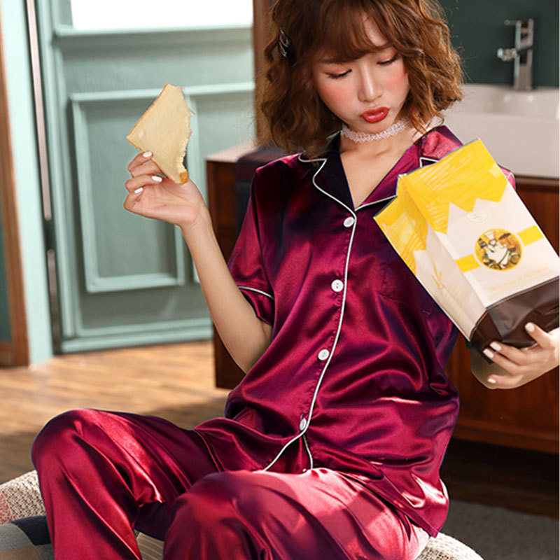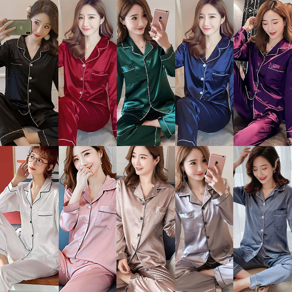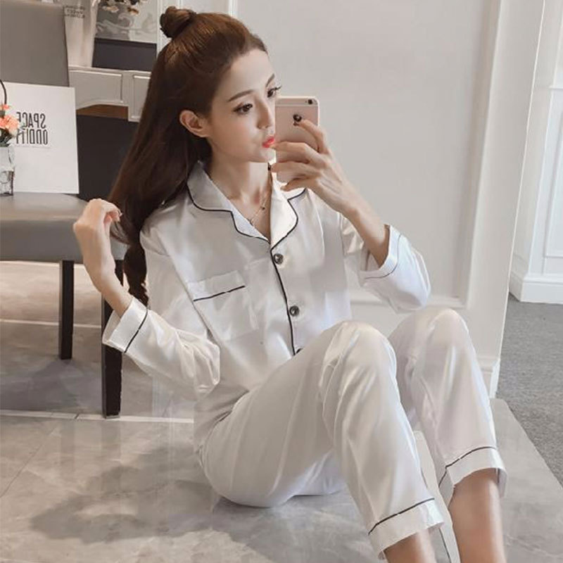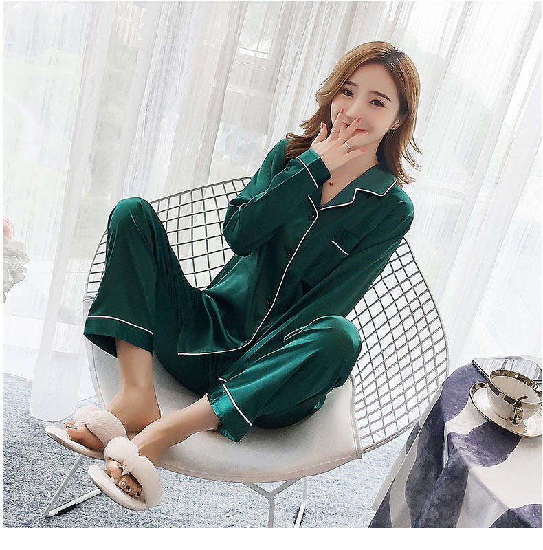 제조 업체 도매 대외 무역 새로운 단색 얼음 실크 카디건 잠옷 여성 긴팔 봄, 가을 모조 실크 홈웨어 세트스토어 가기