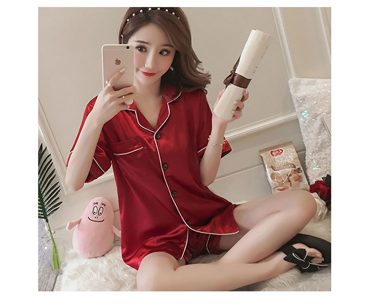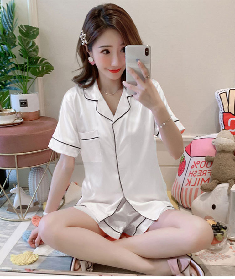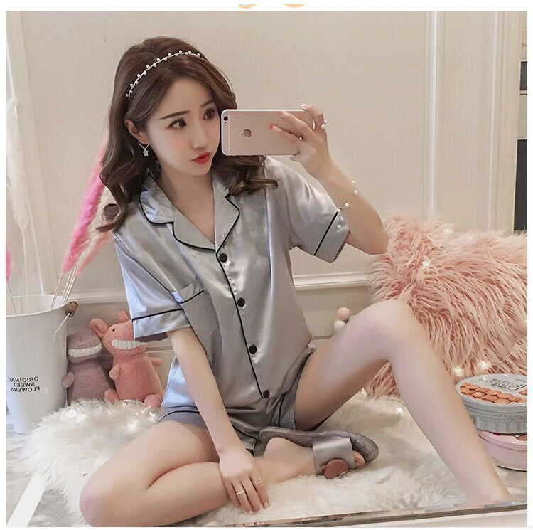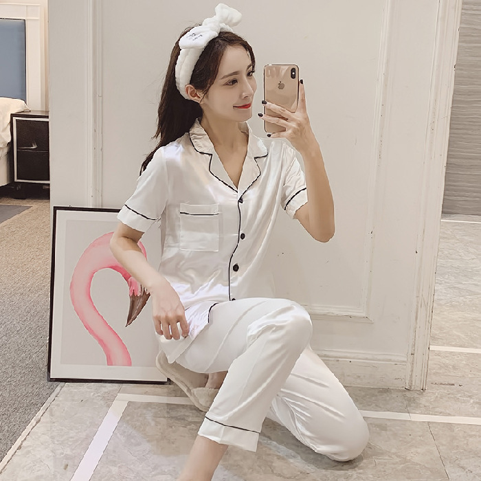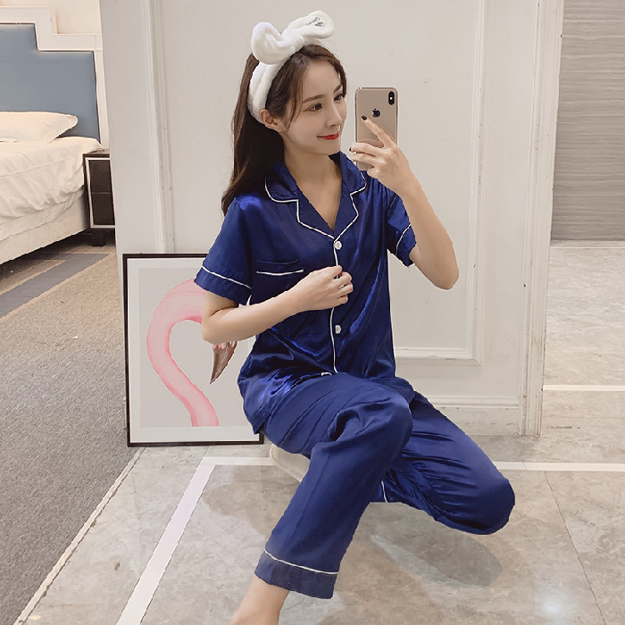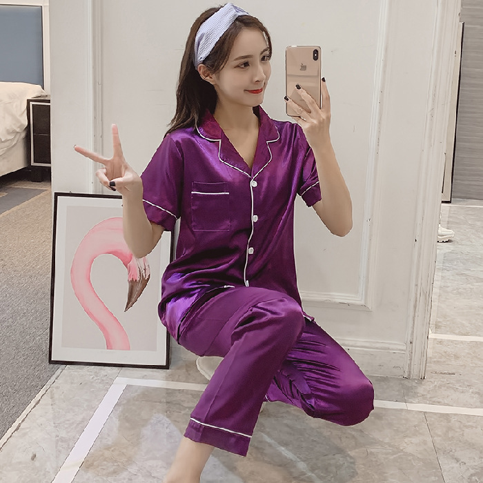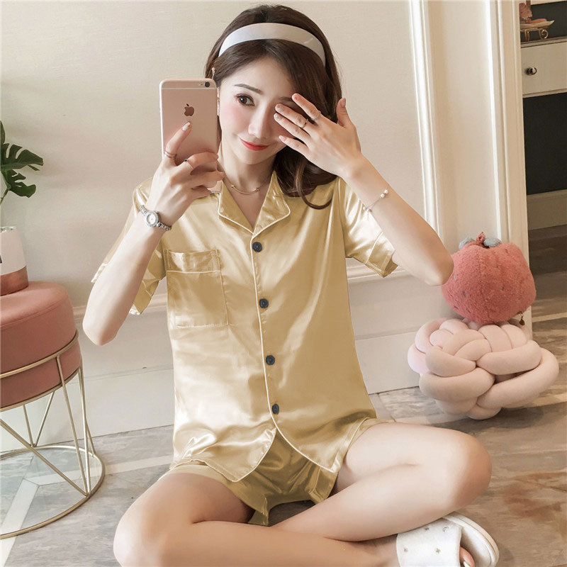 제조 업체 도매 대외 무역 새로운 단색 얼음 실크 카디건 잠옷 여성 긴팔 봄, 가을 모조 실크 홈웨어 세트스토어 가기