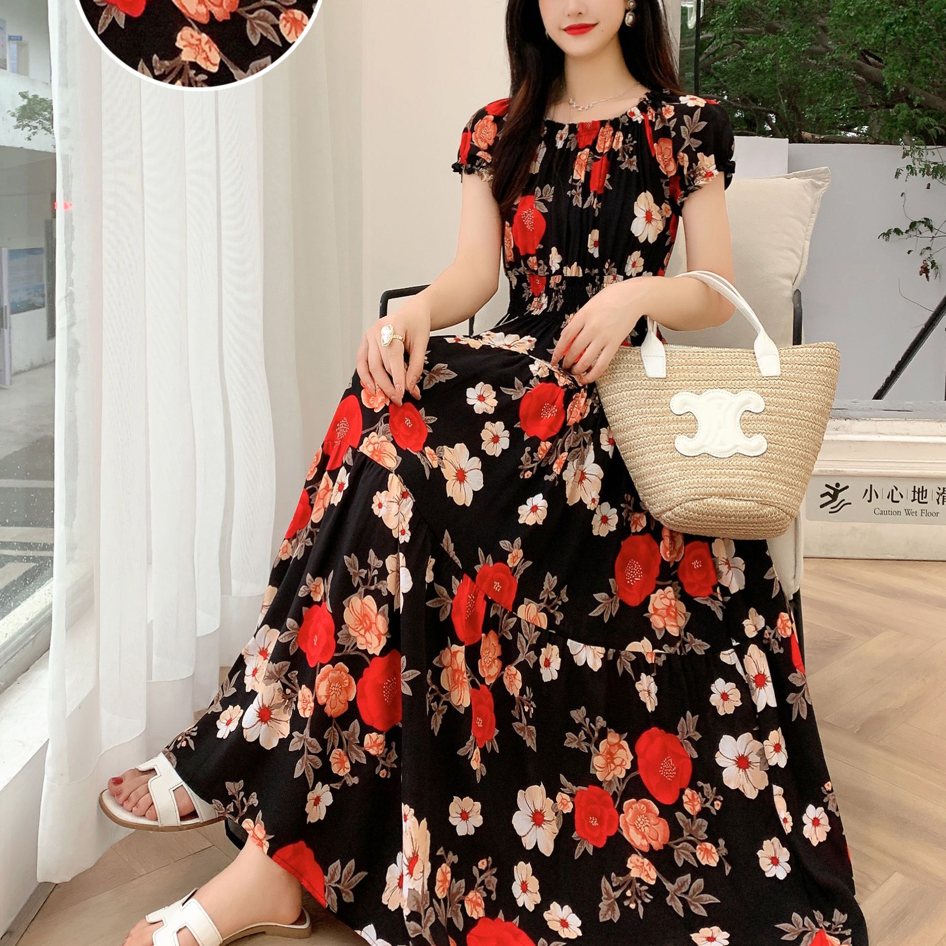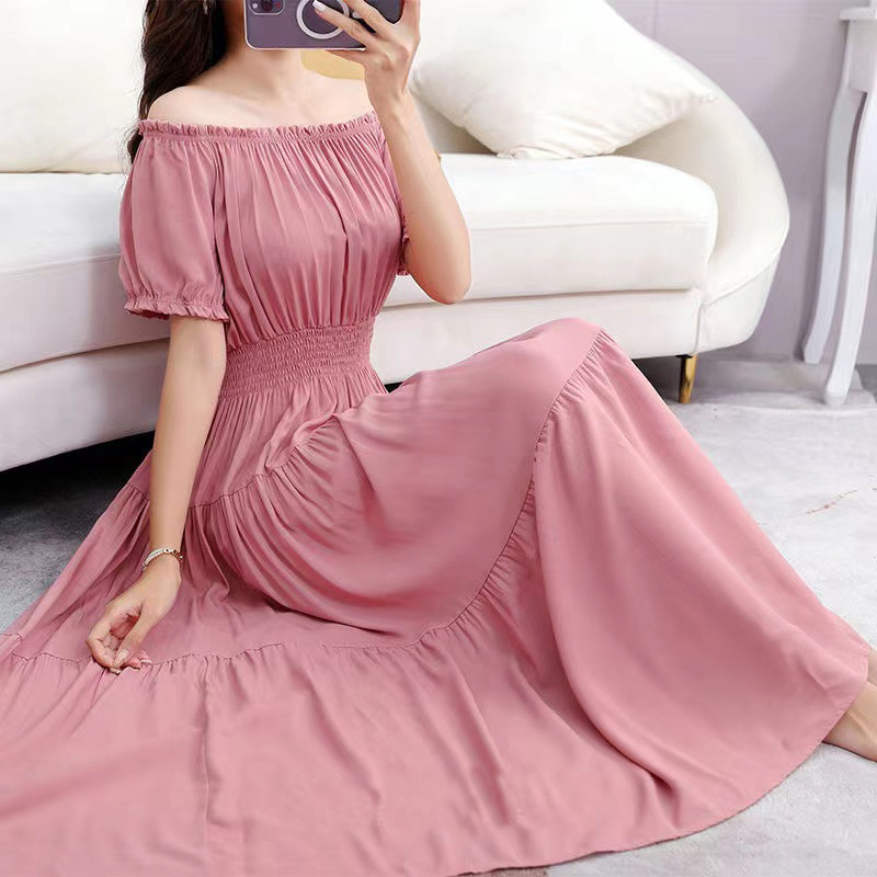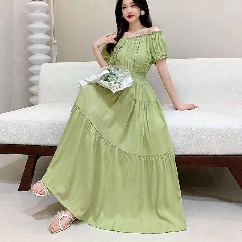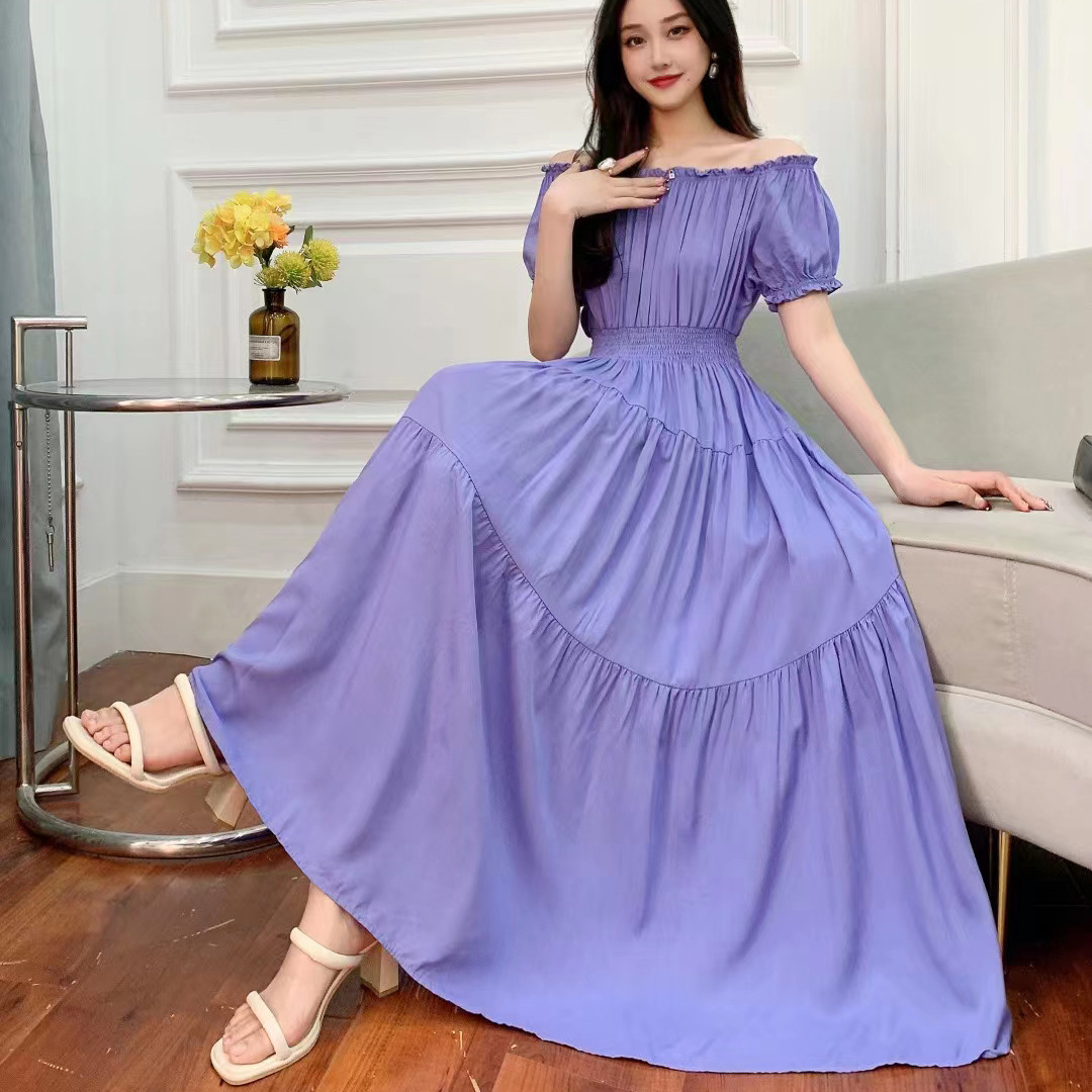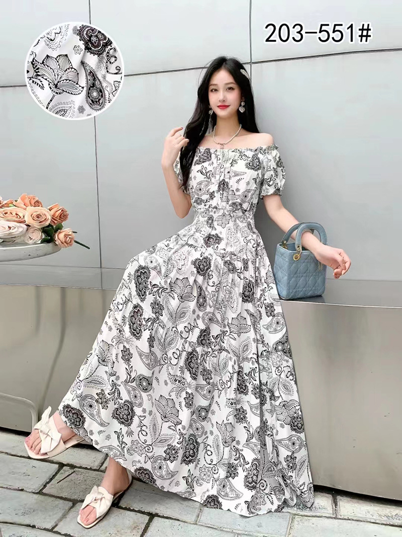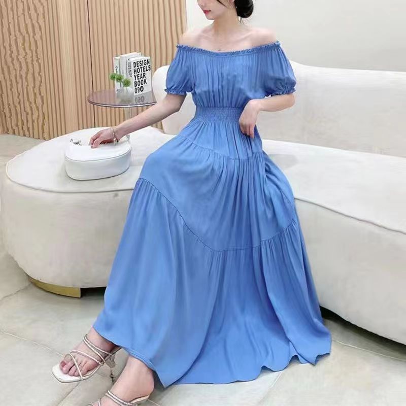 코튼 실크 꽃 어깨 원피스 민족 스타일 느슨한 허리 비치 휴가 스커트 보헤미안 맥시