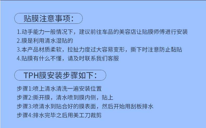 2.此款保护膜安装时时需要配合清水湿贴【水不宜喷洒过多】,不懂得亲可以联系我们客服,勿一味认为配合水就不贴合;