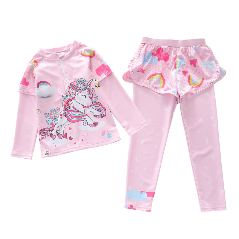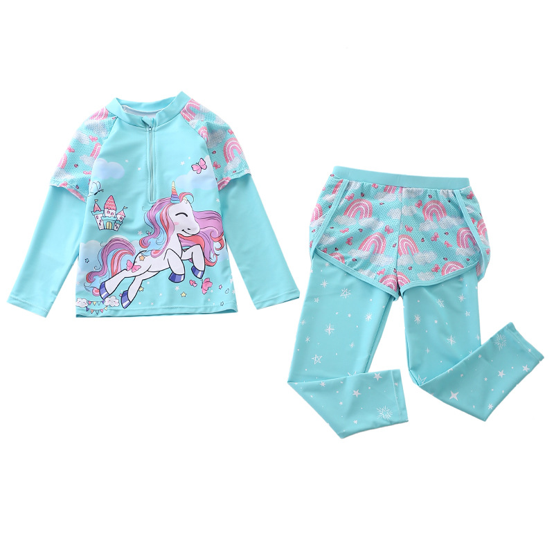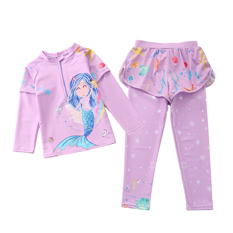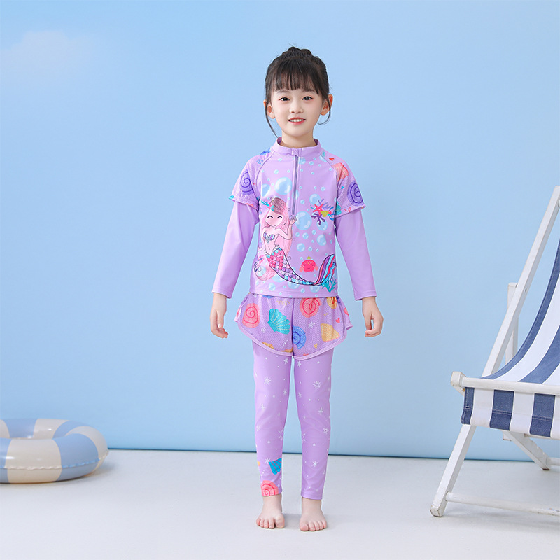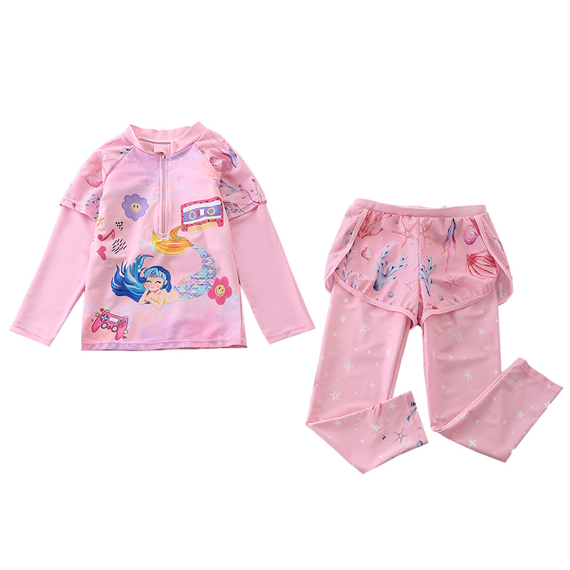 어린이 수영복 여자 여자 스플릿 중간 및 큰 어린이 수영복 긴 소매 바지 꽃 메쉬 반바지 다이빙 수영복