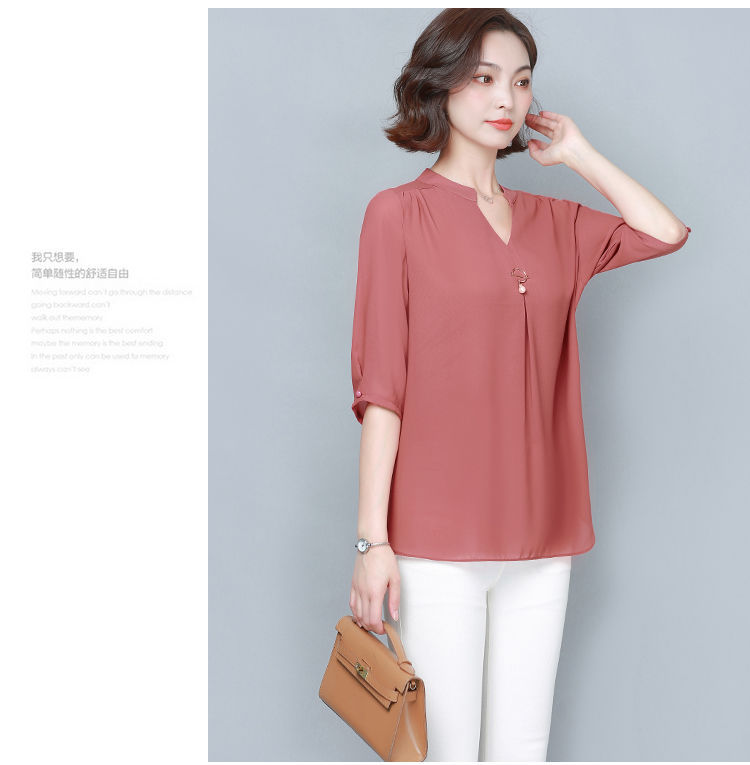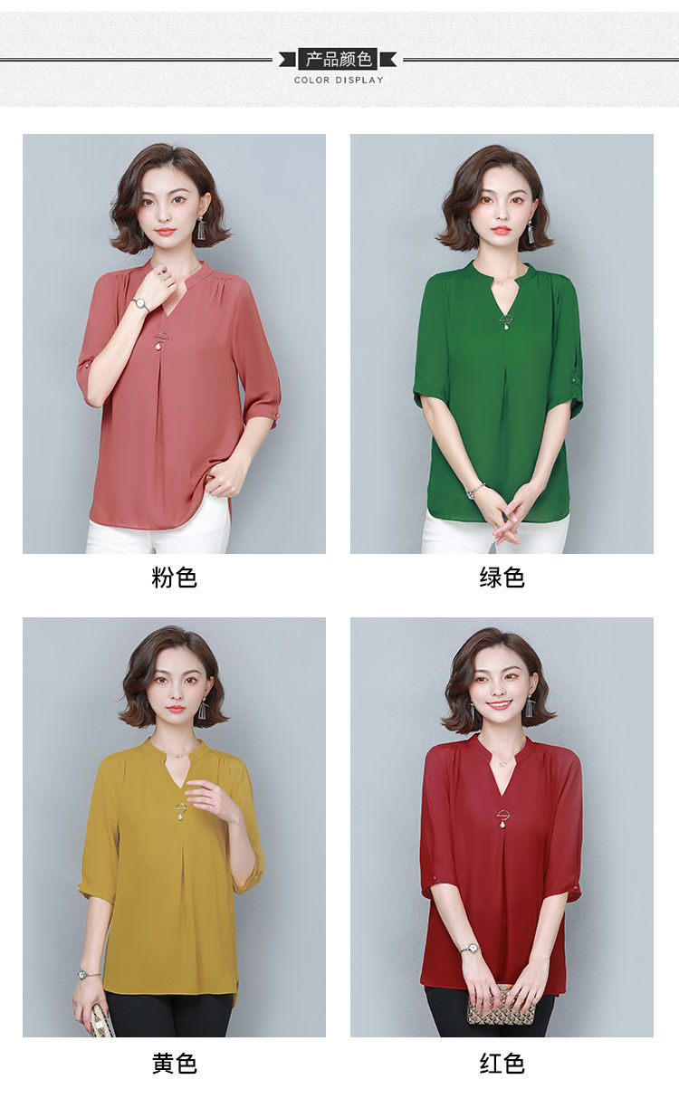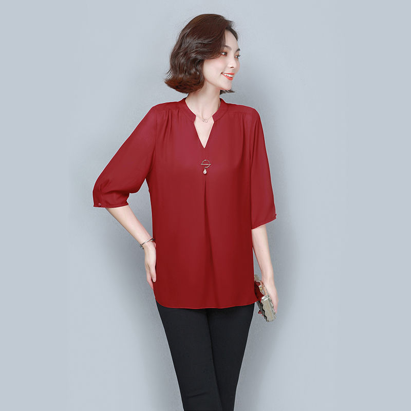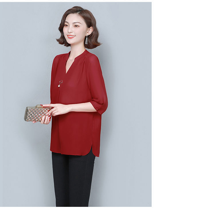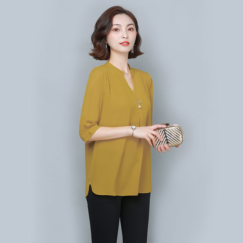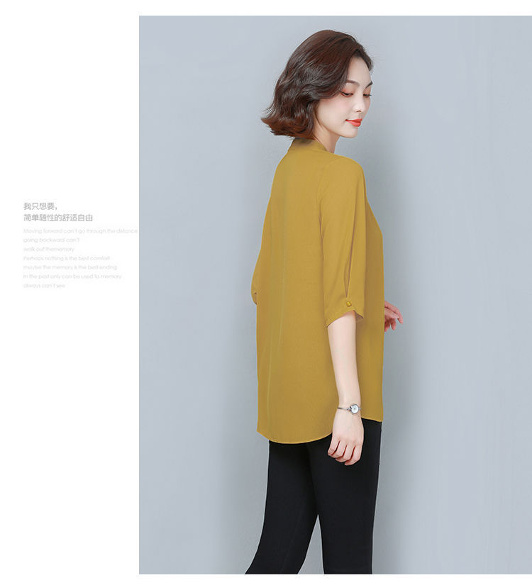 2023 새로운 여름 여성 대형 느슨한 중간 길이 기질 셔츠 중년 어머니 여름 중간 소매 티셔츠
