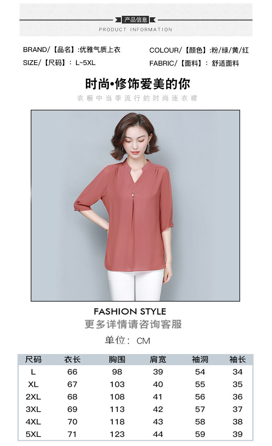 宝贝...制作面料柔软细腻,穿着亲肤!我们郑重承诺:衣服不起球,不褪色,不变形。宝贝支持七天无理由退换货。品质保证,工匠精神。专注产品质量,用心服务客户。尺码建议:,L码【90-115】XL码【110-125斤】.XXL码【125-140斤】3XL【140-155斤】4XL【155-170斤】5XL【170-200斤】.以上尺码建议只是按一般身段比例给出的建议。以尺码表为准,宝贝用的是雪纺面料微弹,建议买大一码。