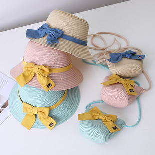 모자 어린이 여름 새로운 밀짚 모자 숄더백 투피스 플라워 테더 웨이브 비브 비치 모자 가방 도매스토어 가기