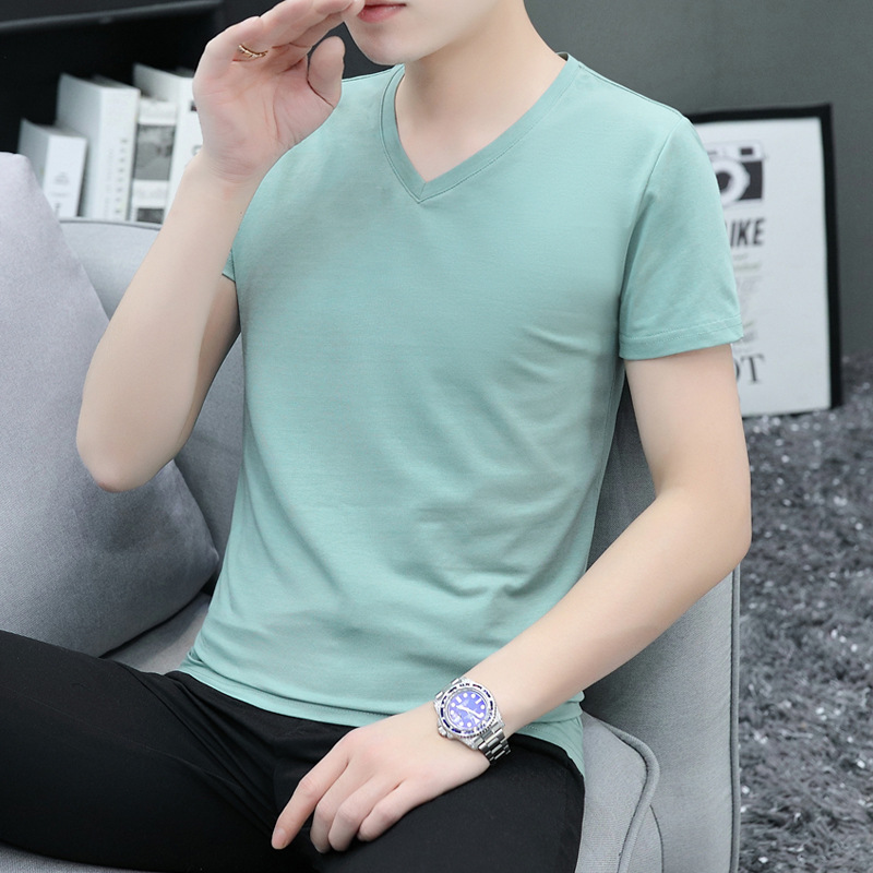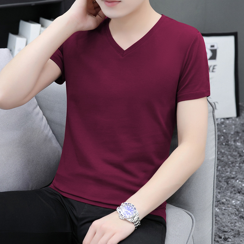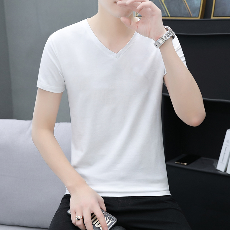 솔리드 컬러 브이넥 반팔 티셔츠 남성용 티셔츠 남성용 면 슬림핏 반팔 티셔츠 베이스 셔츠