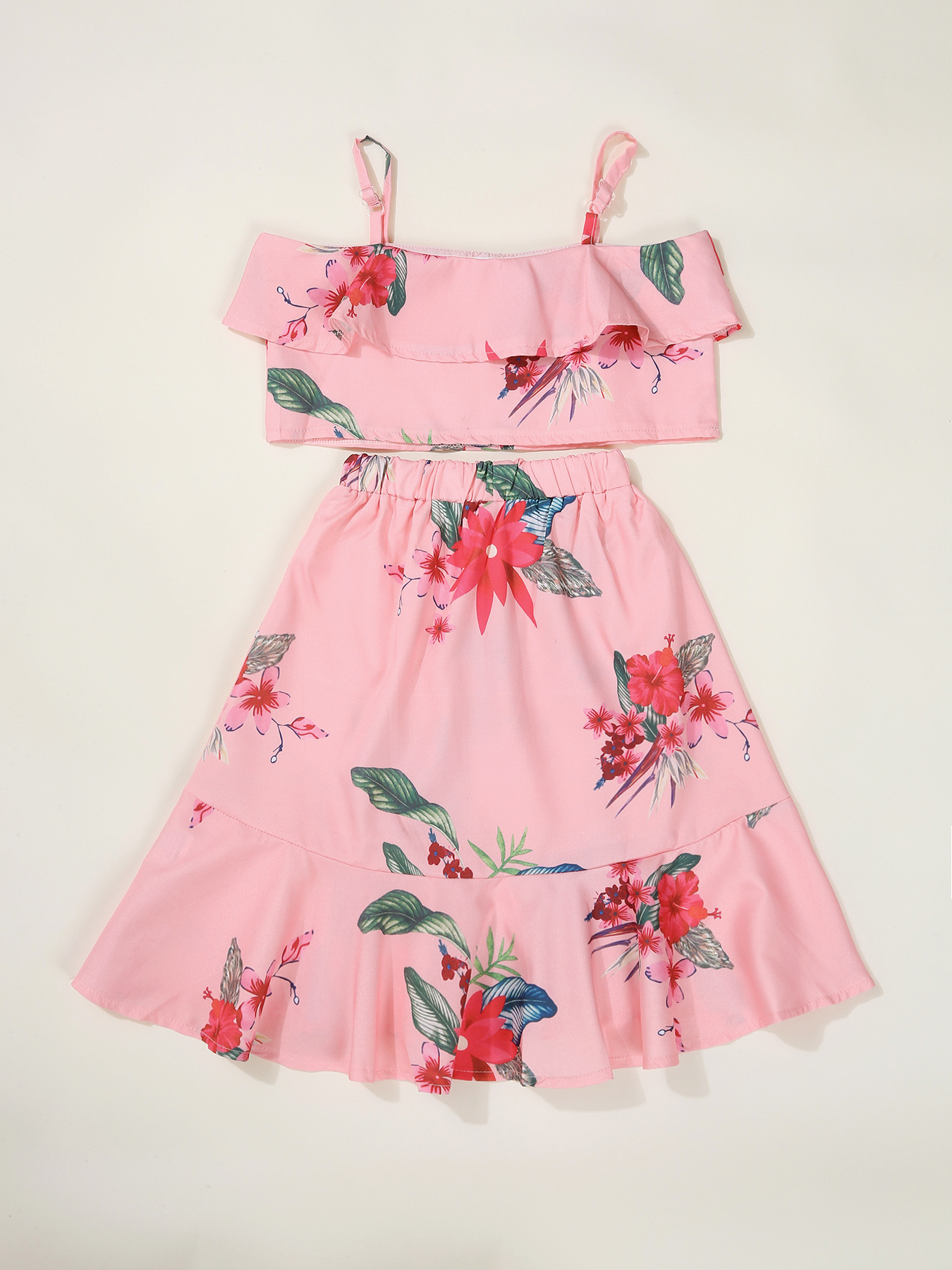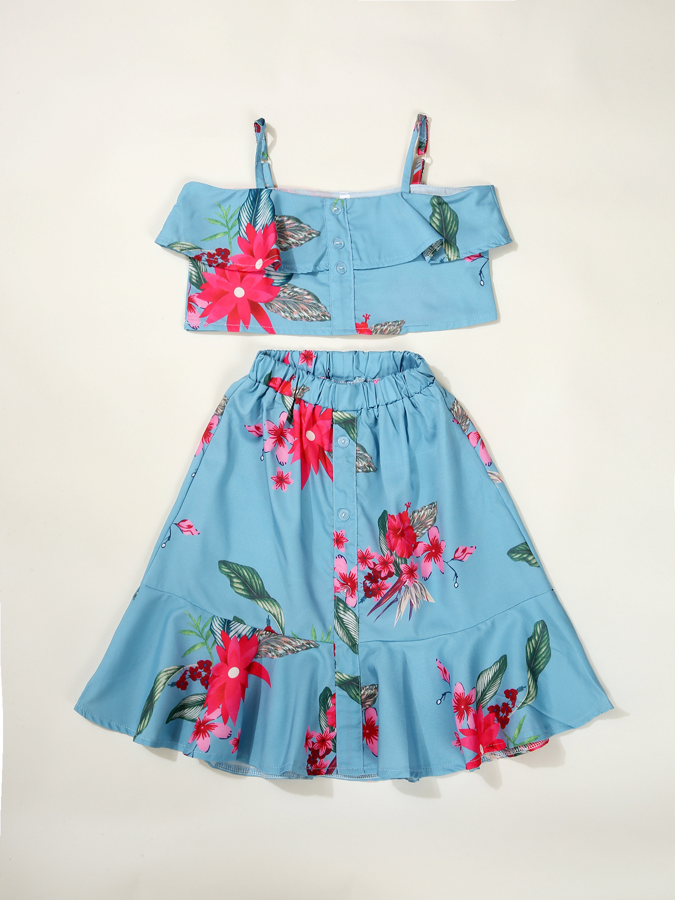 아동복 여름 클래스 긴 대외 무역 슬링 부드러운 꽃 긴 원피스 여아 투피스 쉬폰 인쇄 세트