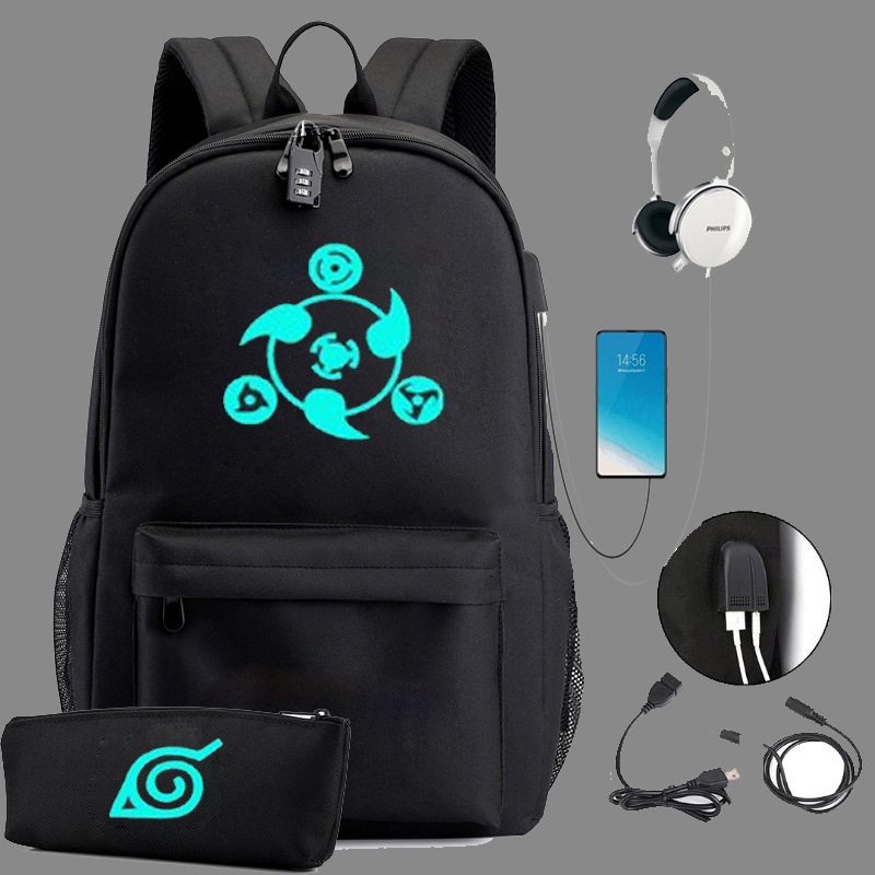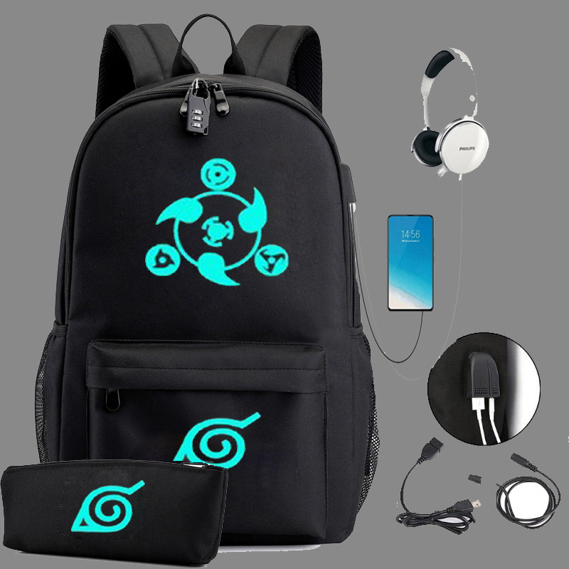 야광 나루토 사륜안 배낭 남자와 여자의 중학생 책가방 한국 애니메이션 USB 충전 배낭 연필 가방