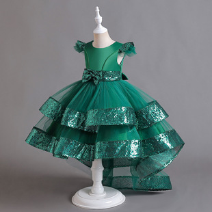 儿童礼服公主裙欧美花童亮片蓬蓬裙表演走秀服女童拖尾连衣裙现货