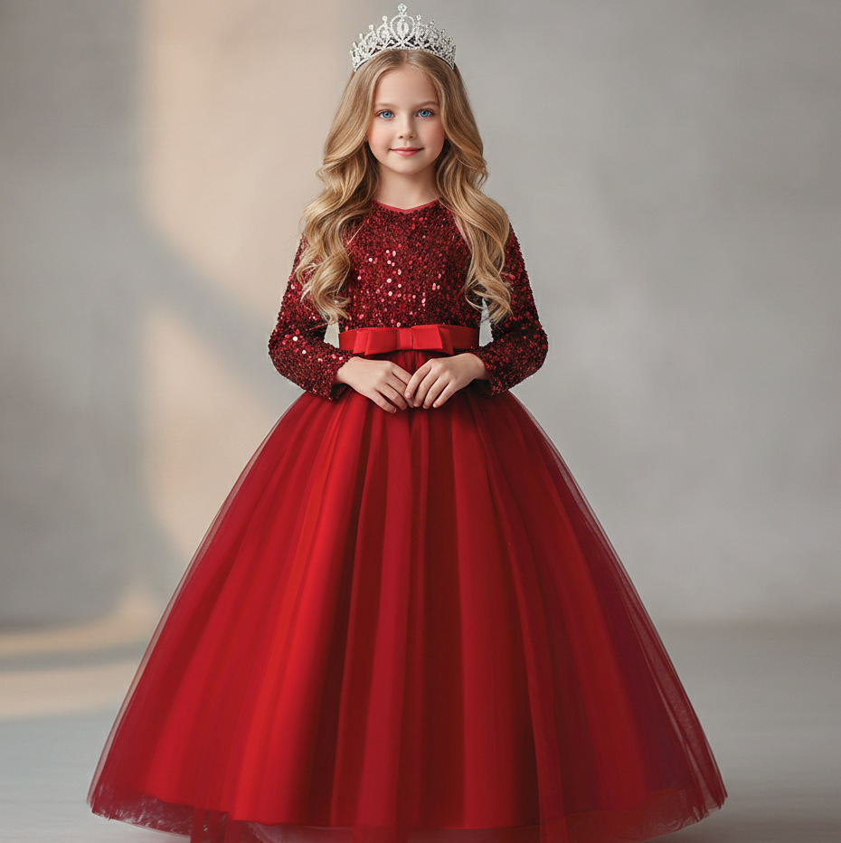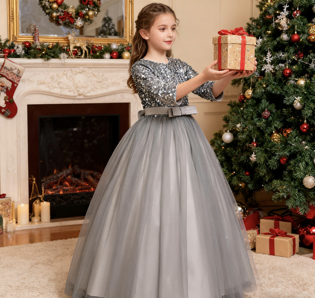 圣诞新款女童公主连衣裙网纱蓬蓬裙小主持人花童亮片钢琴演出礼服