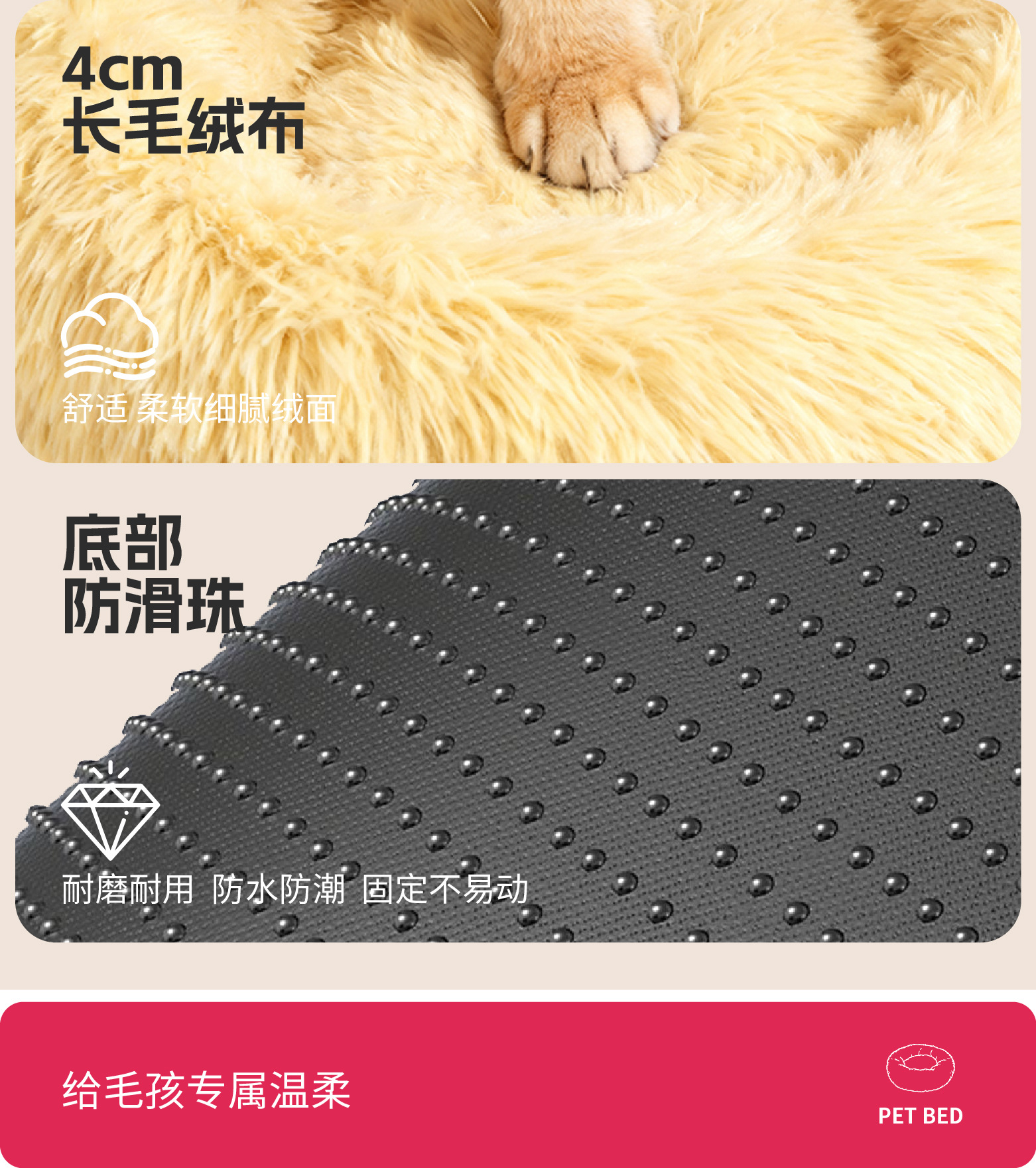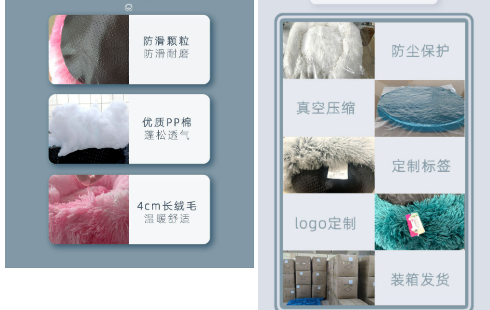产品材质:4cm长绒毛+15D三维pp棉+滴仿硅胶防滑底布