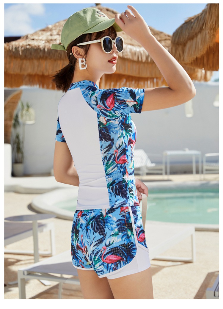 수영복 여성용 스플릿 플랫 코너 투피스 세트 배꼽 덮음 슬리밍 반팔 자외선 차단제 학생 훈련 스포츠 보수적 인 온천 수영복스토어 가기