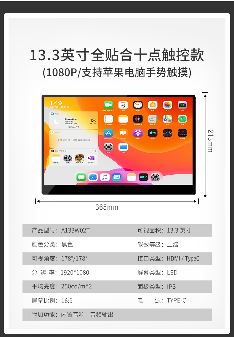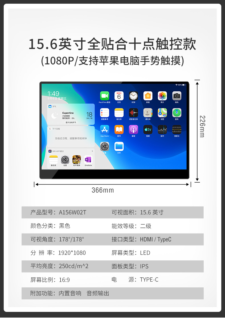 • 15.6inch 완전히 장착된 10포인트 터치(Apple 컴퓨터 제스처 터치 지원) 1080P