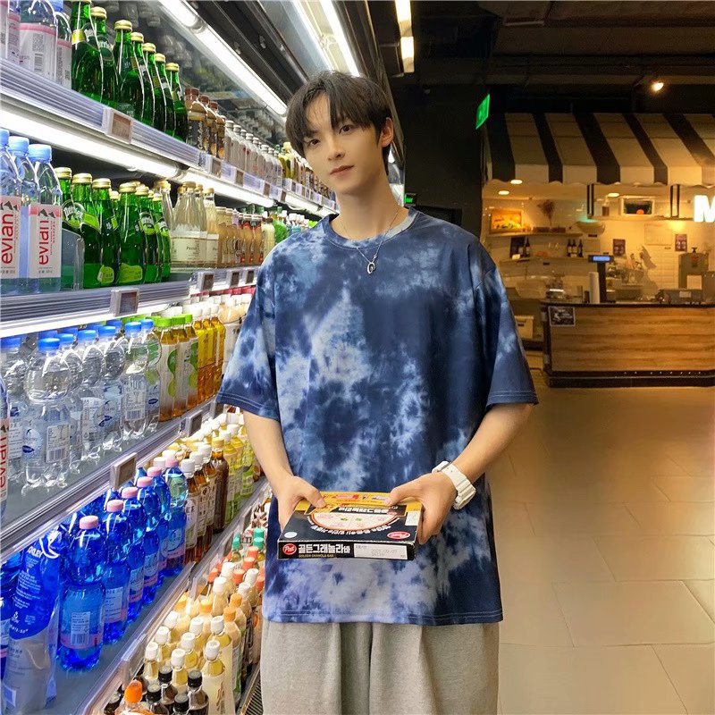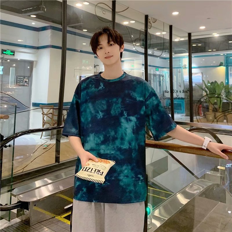 In 타이 다이 잉크 염색 여름 티셔츠 소년 느슨한 반팔 티셔츠 트렌디 한 라운드 넥 새로운 패션 홍콩 스타일 남성스토어 가기
