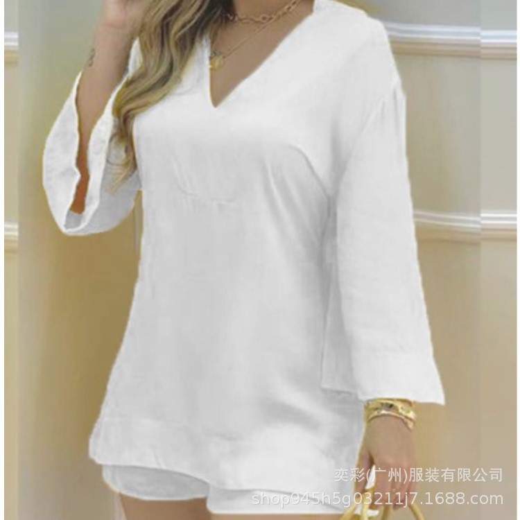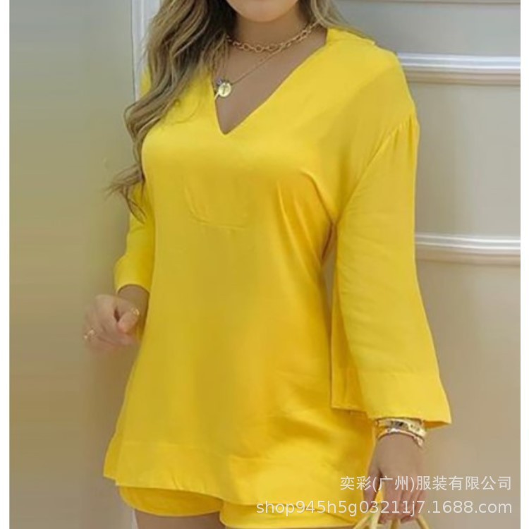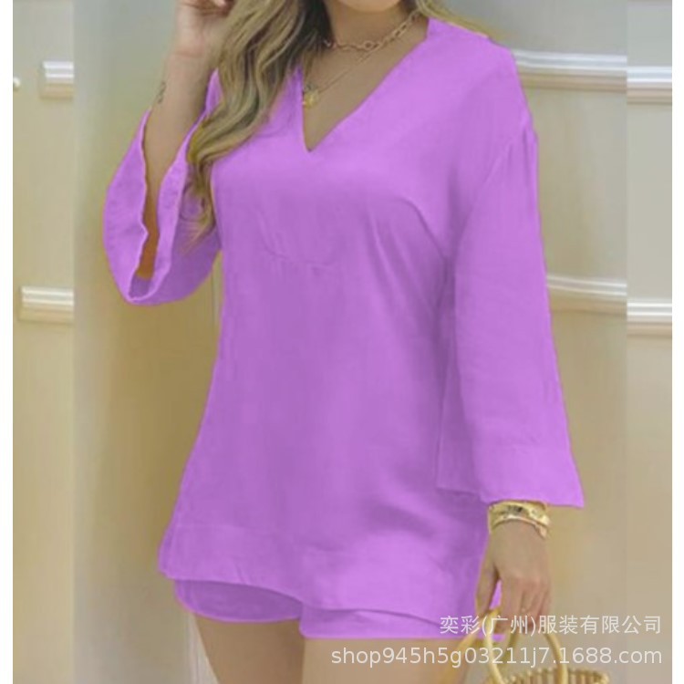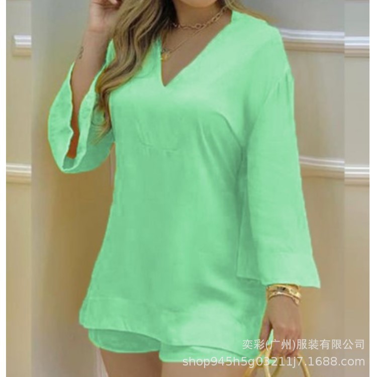 2023 유럽과 미국 여성의 패션 세트 폭발 단색 뿔 슬리브 V-넥 탑과 반바지 편안한 패션 세트스토어 가기